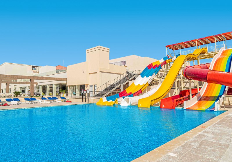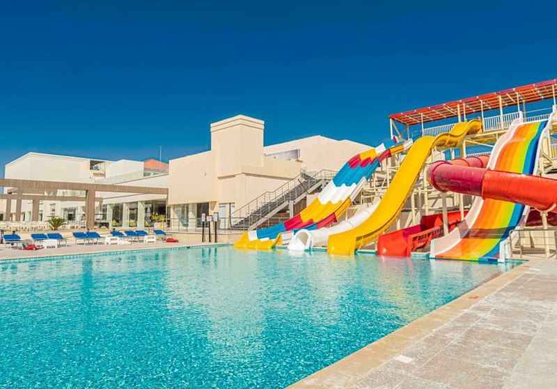 Fünf Außenpools, teils beheizbar, bilden das Herz der Anlage. Dazu kommen ein großer Aqua Park mit sieben Rutschen, Kinderpool und Mini Aqua Park. WLAN ist in der gesamten Anlage verfügbar, die hoteleigene Promenade integriert Shops und Services. Highlight: Wasserwelten und Infrastruktur direkt vor der Tür.