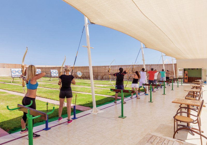 Direkt am Strand startet Ihr an der Wassersportstation; angeboten werden unter anderem Katamaransegeln und Windsurfen. Die Tauchbasis „Extra Divers“ organisiert Kurse und Ausfahrten. An Land trainiert Ihr im Fitnessraum oder spielt Tennis unter Flutlicht. Ergänzend stehen Tischtennis, Boccia, Basketball, Mini‑Fußball, Volleyball, Billard, Darts und Bogenschießen bereit.