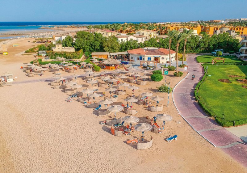 Im Cleopatra Luxury Resort Makadi Bay wohnt Ihr in einem weitläufigen Resort direkt am Sandstrand der Makadi Bay. Die 2- bis 3‑stöckigen Gebäude gruppieren sich um mehrere Pools und sonnige Plätze. Tagsüber erwartet Euch eine lebendige Urlaubsatmosphäre mit Animation, am Abend übernehmen Shows, Livemusik und die Diskothek den Takt. Familien profitieren von Kinderpools, Spielplatz und Miniclub, Ruhesuchende finden stille Ecken auf Sonnenterrassen oder im Spa. Der hoteleigene Steg führt über das vorgelagerte Riff – ideal, um bequem ins tiefe Wasser einzusteigen.