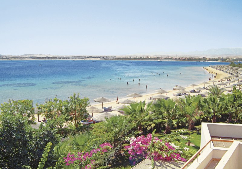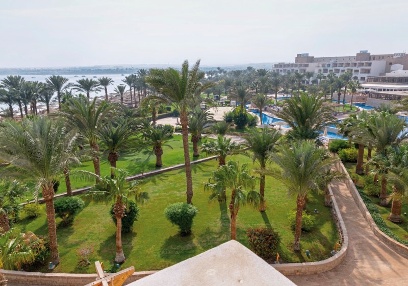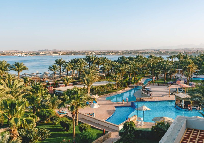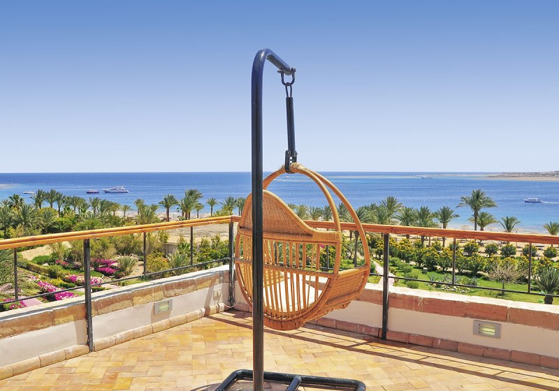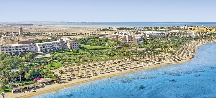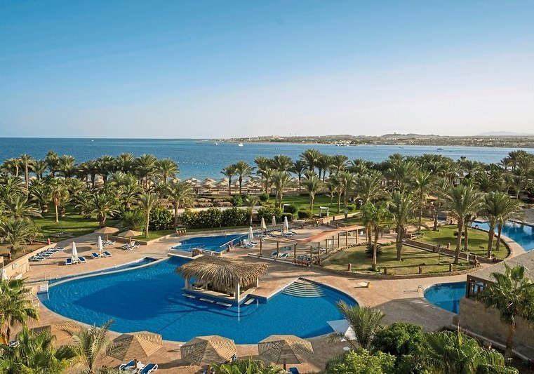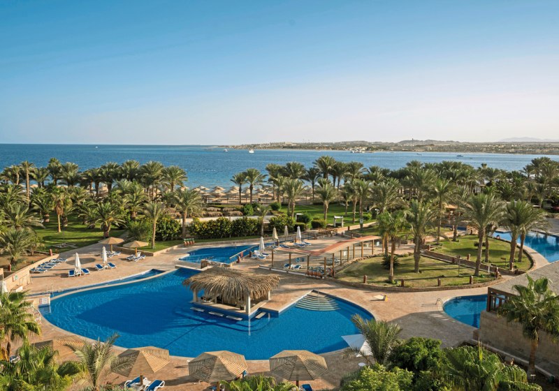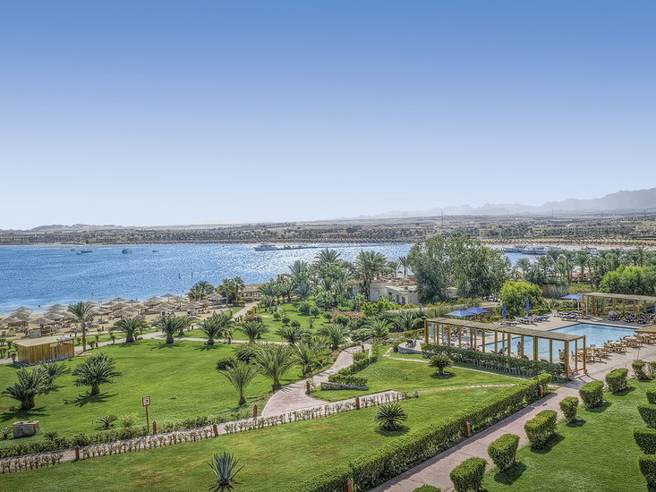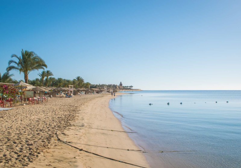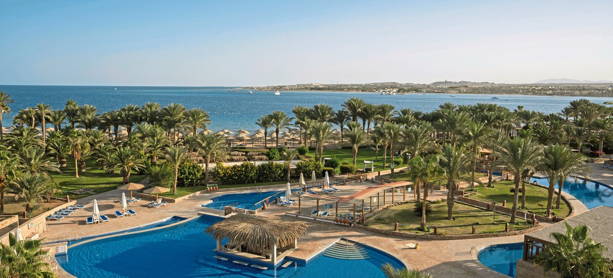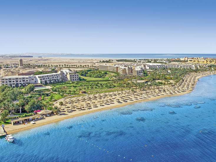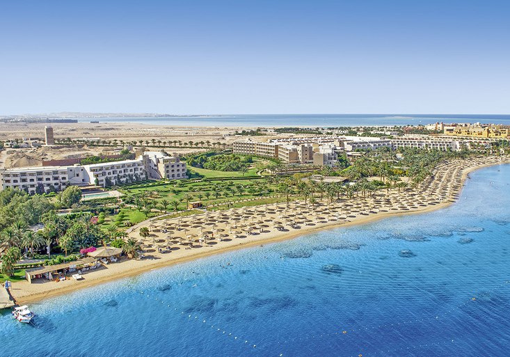 Ihr residiert direkt am Sandstrand der Makadi Bay, etwa 30 Kilometer vom Zentrum und Flughafen Hurghada entfernt. Die Lage verbindet Strandkomfort mit gut planbaren An- und Abreisen. So erreicht Ihr die urbane Infrastruktur Hurghadas in kalkulierbarer Distanz, bleibt aber klar in einem Strandsetting mit weitläufigen Arealen.