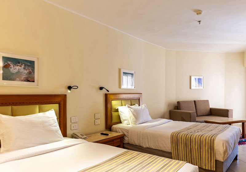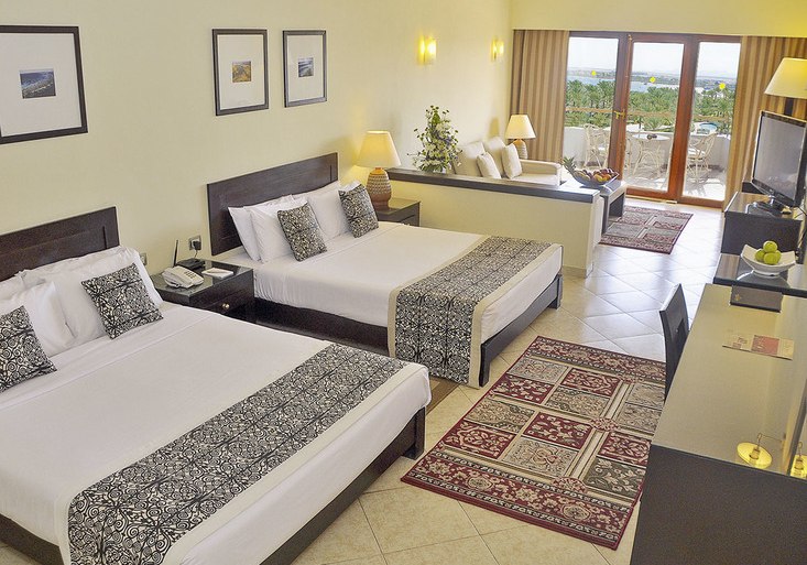 Ihr wählt zwischen drei Bereichen: Fort Arabesque Resort mit 330 Zimmern, Westbay mit 247 Zimmern und Suiten ab 16 Jahren sowie The Villas mit 65 Einheiten, ebenfalls ab 16 Jahren. Alle Zimmer bieten Bad oder Dusche, WC, Föhn, Telefon, Safe, Sat-TV, Minibar, Kaffee- und Teezubereiter, individuell regulierbare Klimaanlage sowie Balkon oder Terrasse.