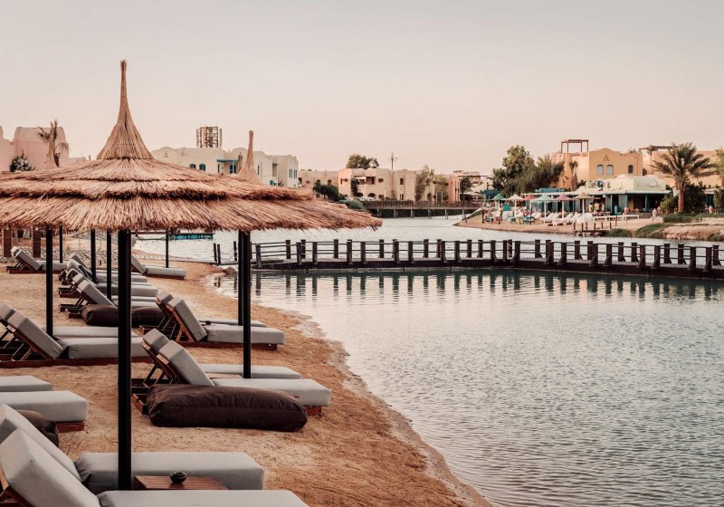 Im Cook's Club El Gouna wohnt Ihr direkt an einer stillen Salzwasserlagune mit kleinem Privatstrand. Das Adults-only-Konzept ab 16 Jahren bringt Ruhe und einen klaren Fokus auf entspanntes Miteinander. Die offenen Bereiche wirken luftig, der Blick schweift über Wasser und Stege. Ihr kommt an, atmet durch und nehmt das Lagunenlicht in Euch auf.