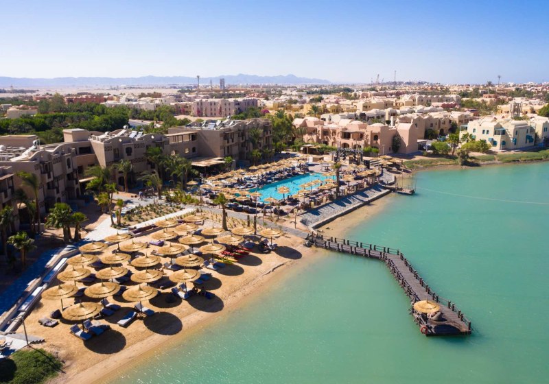 Ihr residiert in El Gouna direkt an einer Salzwasserlagune mit kleinem Privatstrand. Bis zum Zeytouna Beach sind es 700 Meter, der lange Zeytouna Pier markiert den Weg ins Meer. Downtown erreicht Ihr zu Fuß oder bequem per handbetriebener Fähre. So verbindet Ihr entspannte Ufermomente mit kurzen Wegen.