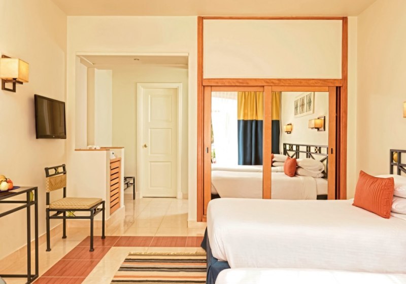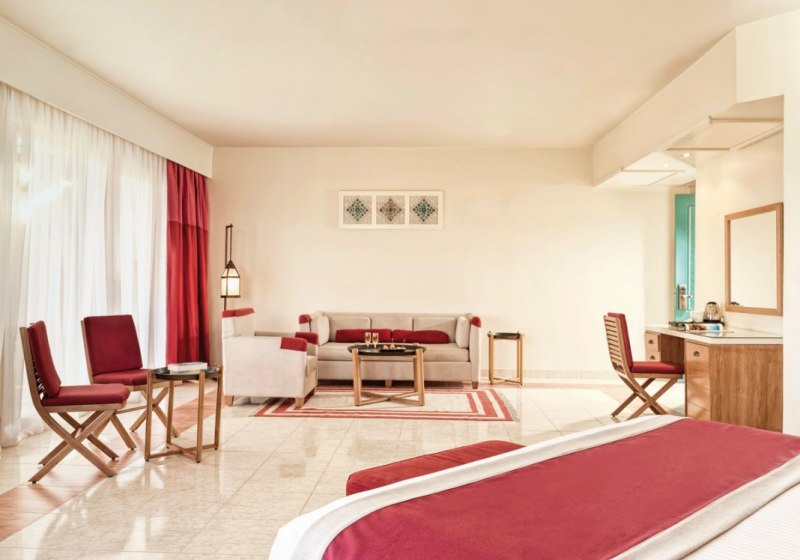 Juniorsuiten verfügen zusätzlich über einen Föhn; ausgewählte Einheiten sind barrierearm ausgewiesen, ohne ins Detail zu gehen. Der Stil ist funktional, mit Fokus auf Raum und Nutzwert. Viele Zimmer öffnen sich zum Garten-, Pool- oder Strandbereich. Highlight: Familienzimmer mit klarem Zuschnitt für mehr Bewegungsfläche.