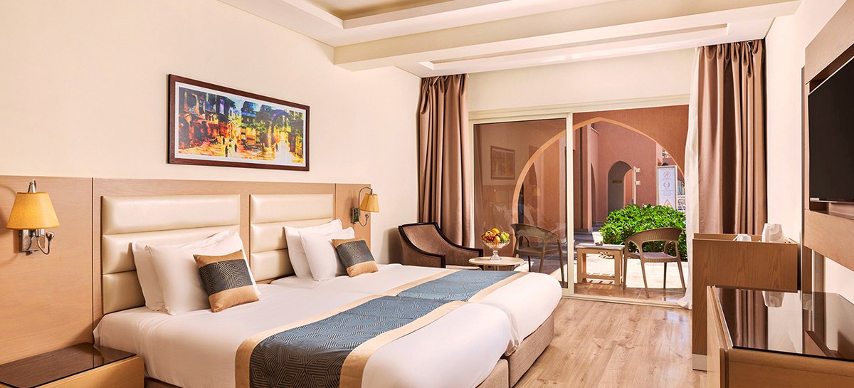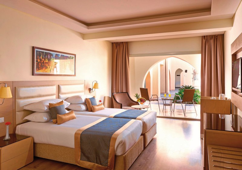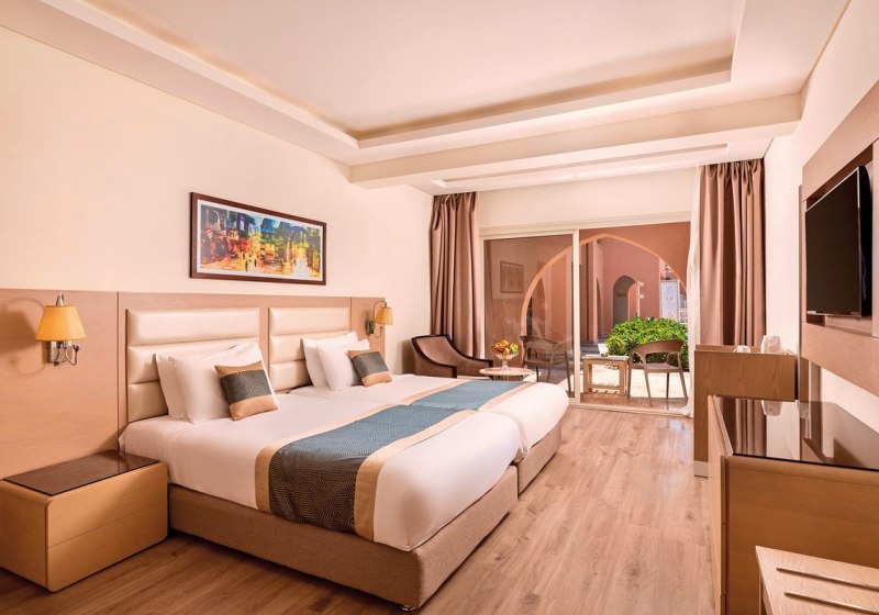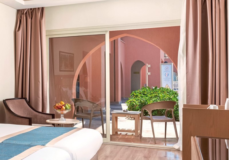 Ihr wohnt in Zimmern mit Balkon oder Terrasse, wahlweise mit Garten- oder Poolblick. Klimaanlage und Minibar bzw. Minikühlschrank sorgen für konstante Erfrischung, der Safe schützt Wertsachen. Zur Grundausstattung zählen TV, Telefon, WiFi und Schreibtisch; Fliesen- oder Parkettboden unterstreicht die klare, pflegeleichte Anmutung.