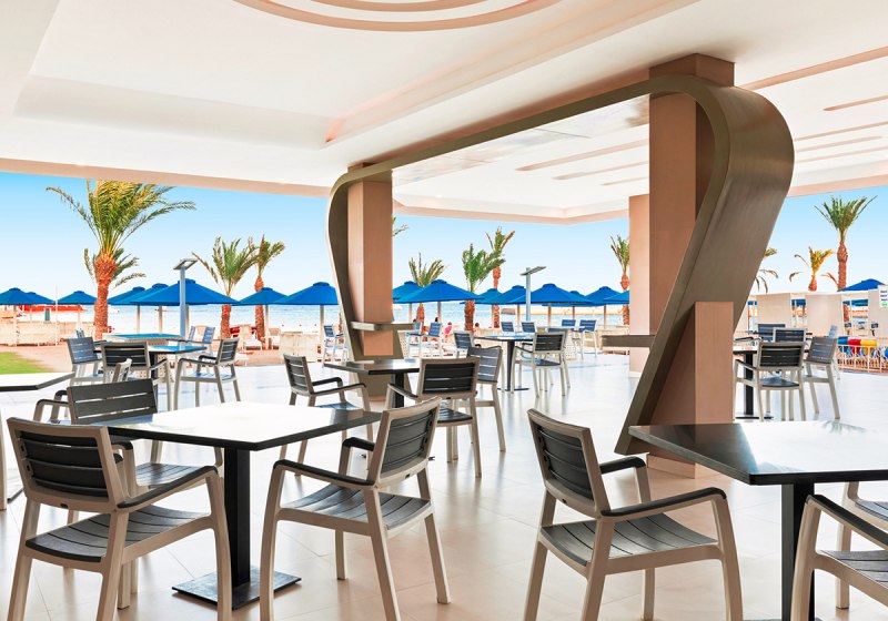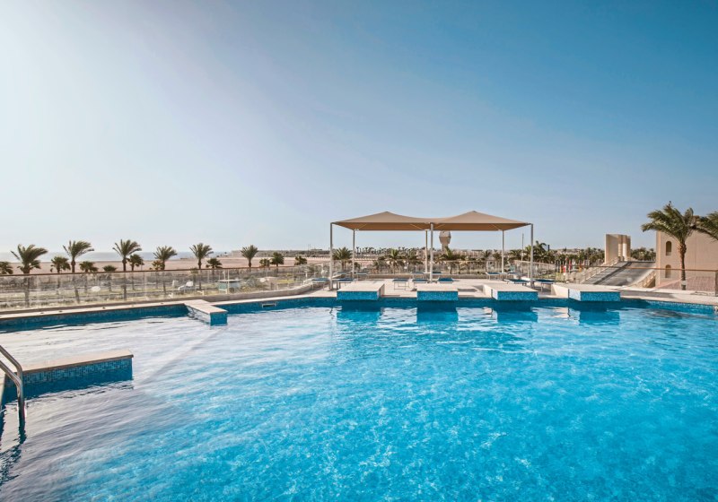 Die Anlage ist auf Bewegung und Übersicht ausgelegt: fünf Swimmingpools, darunter ein Adults-Only-Pool und ein Dachpool, strukturieren die Bereiche klar. Liegen, Sonnenschirme und Badetücher stehen am Pool bereit, am Strand warten zusätzlich Liegen und Schirme. WLAN nutzt Ihr in der gesamten Anlage und in den Zimmern. Highlight: Adults-Only-Dachpool mit angeschlossener Red Sky Bar.