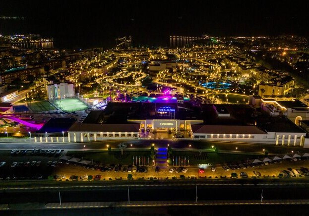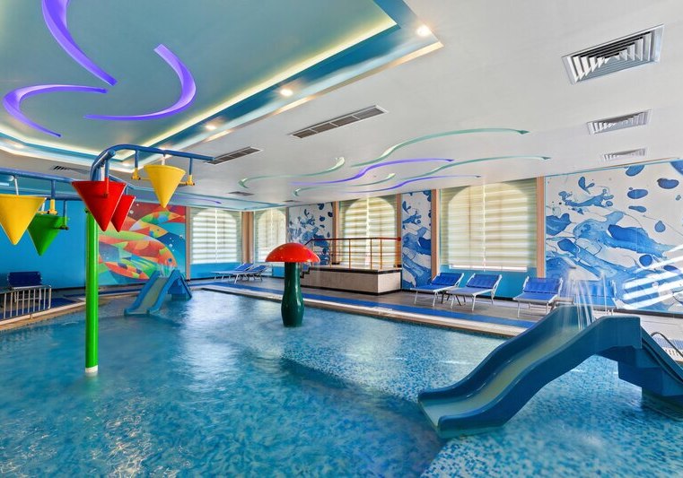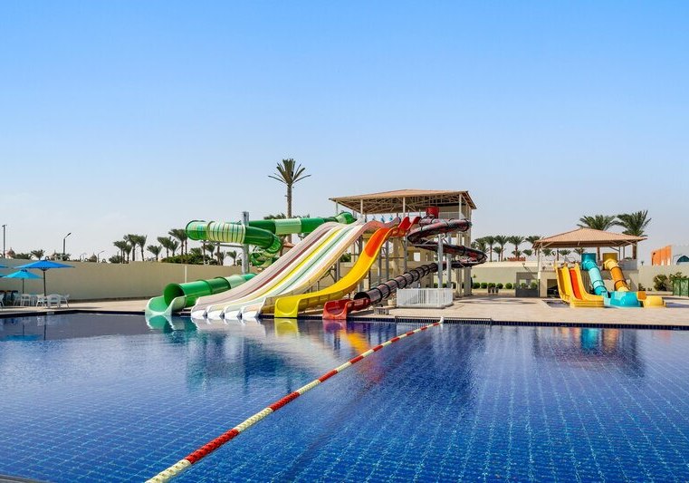 Im Außenbereich warten vier Pools, davon drei beheizbar, dazu Kinderbecken, sieben Wasserrutschen und eine Sonnenterrasse mit Liegen, Schirmen und Badetüchern an Pool und Strand. Ein Wasserpark und Außenmöbel schaffen klare Familien- und Relaxzonen. Ergänzt wird die Anlage durch Theater, Diskothek, Spielzimmer und Arcade-Bereich. Für Meetings stehen Business-Center und Konferenzraum bereit. Highlight: Vier Außenpools und Wasserpark strukturieren Aktiv- und Familienbereiche übersichtlich.
