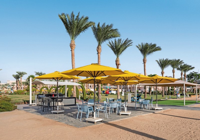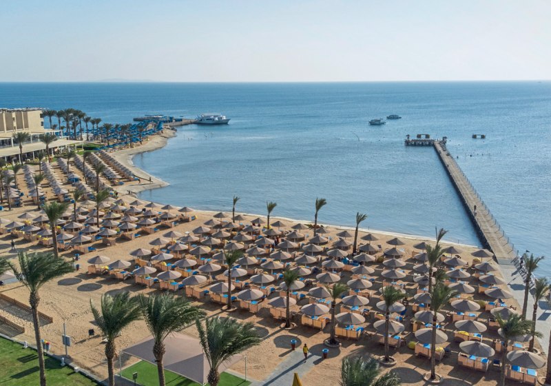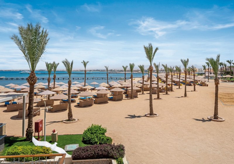 Ihr residiert in Hurghada direkt am hoteleigenen Sandstrand mit Hausriff. Das Zentrum liegt etwa 15 Kilometer entfernt, der Flughafen rund 7 Kilometer – der Transfer bleibt entsprechend kurz, gelegentlicher Fluglärm ist möglich. Am Strand stehen Liegen und Sonnenschirme bereit; die Strandbar versorgt Euch mit kühlen Getränken.
