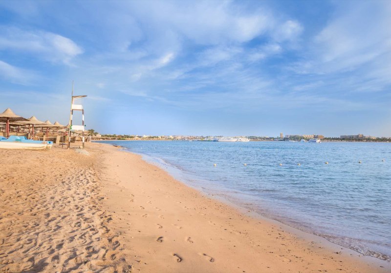 Ihr residiert in Ägypten, in Hurghada/Makadi Bay, direkt am Sandstrand der Makadi-Bucht. Die Atmosphäre ist ruhig, der Blick klar aufs Meer gerichtet. Hurghada liegt etwa 35 Kilometer entfernt, der Flughafen rund 30 Kilometer; beides erreicht Ihr in etwa 30 Minuten Fahrzeit. Der Makadi Souk befindet sich wenige Meter von der Anlage, Einkaufsmöglichkeiten sind entsprechend nah.