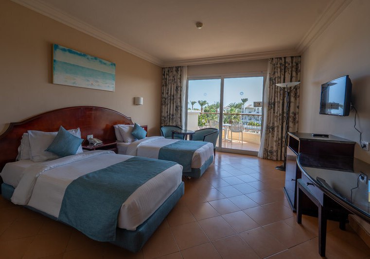 Die Adresse an der Hurghada–Safaga Road, Kilometer 34, verankert Euch direkt an der Makadi Bay. Ihr nutzt den hoteleigenen Strand und spaziert unmittelbar hinaus auf die Makadi-Promenade mit zusätzlichen Restaurants und Bars. Das Meer liegt vor der Tür, eine Apotheke erreicht Ihr in rund zwei Gehminuten – praktisch im Alltag.
