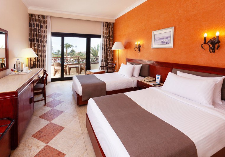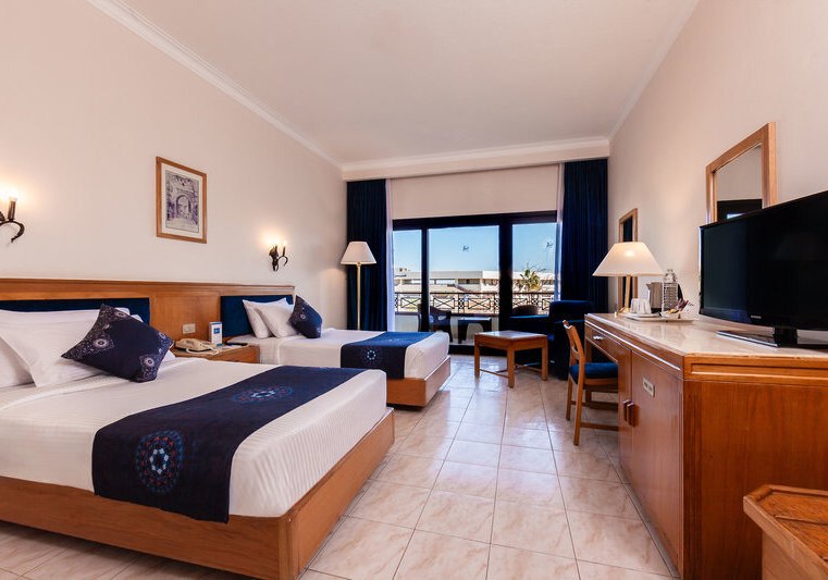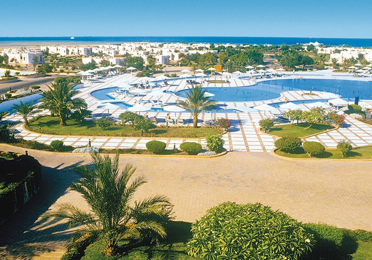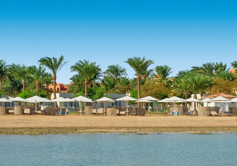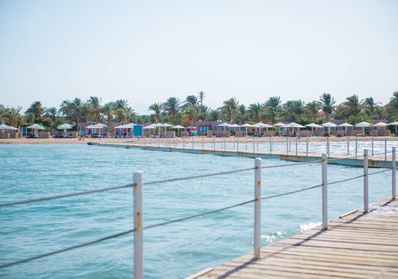 Ihr wohnt an der South Sahl Hasheesh Road direkt am Sandstrand von Hurghada. Das Hausriff liegt unmittelbar vor dem Resort, ein Steg führt bequem über das Riff in tieferes Wasser. Der Transfer ist kurz: etwa 12 Kilometer zum Flughafen, rund 18 Kilometer ins Zentrum von Hurghada. Die Lage kombiniert Badekomfort und gute Erreichbarkeit, ideal für Tage am Meer mit klarer Orientierung zwischen Strand, Riff und den weitläufigen Flächen der Anlage.