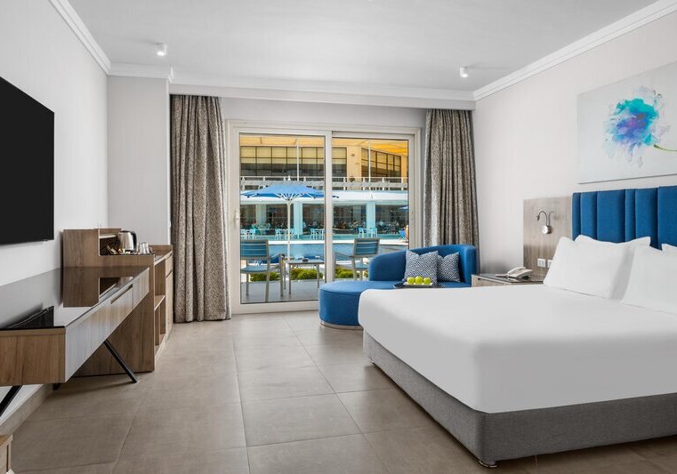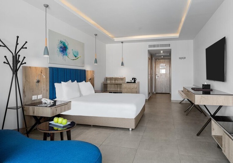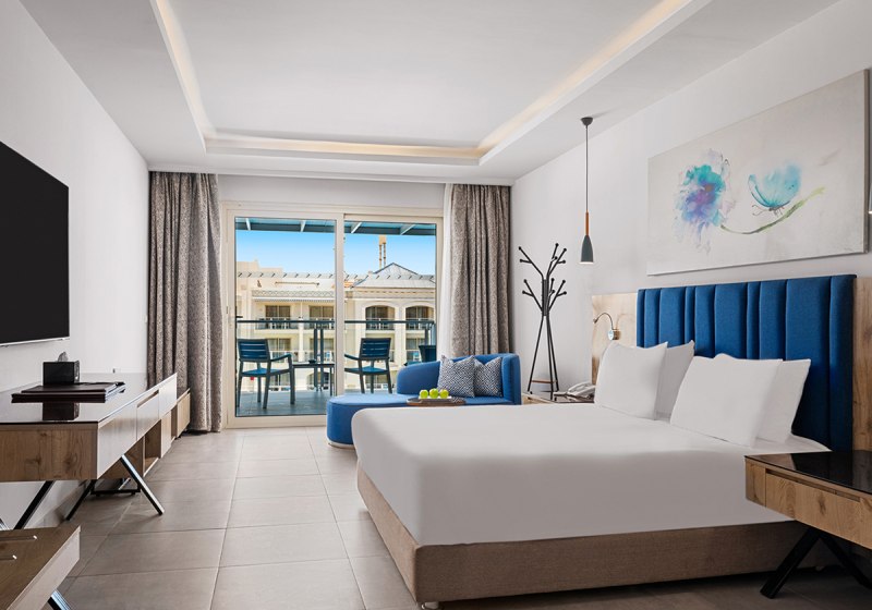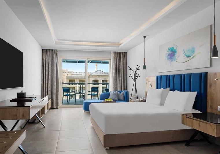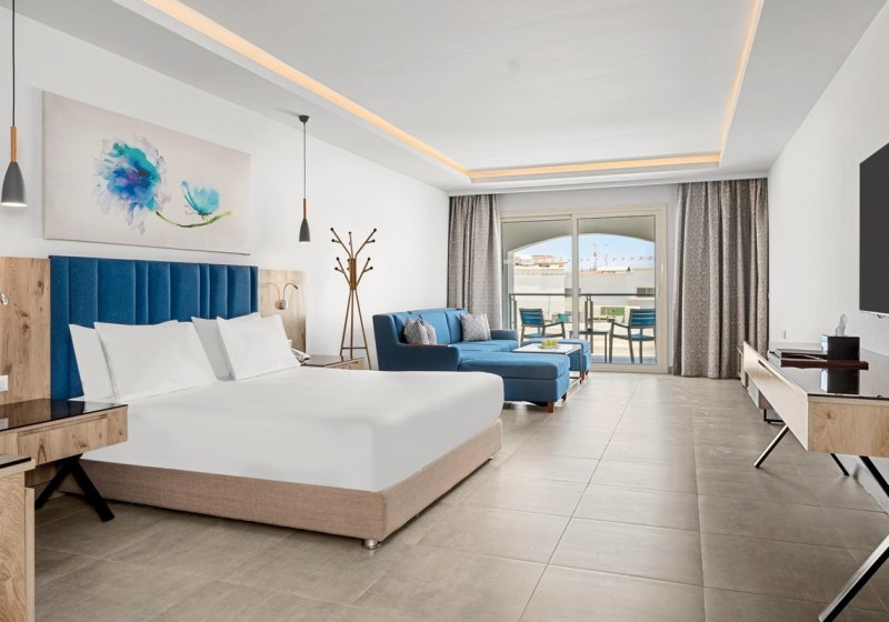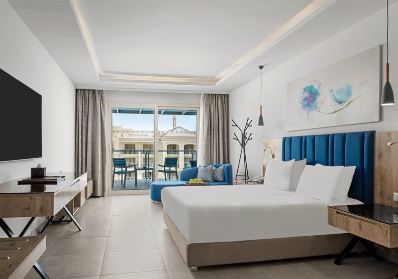 Die Zimmer messen je nach Kategorie etwa 42 bis 63 m² und bieten Balkon oder Terrasse. Ihr nutzt Klimaanlage, Safe, Wasserkocher und Minibar; Sat-TV und kostenloses WLAN sorgen für Komfort. Bad mit Dusche/WC und Föhn, dazu ein klar strukturierter Grundriss. Highlight: Großzügige Zimmergrößen für entspanntes Wohnen.