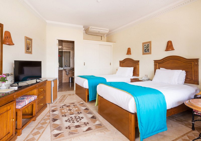 Ihr wählt zwischen Doppelzimmern, Bungalows und Familienzimmern. Die Doppelzimmer bieten 36 bis 40 Quadratmeter, Familienzimmer 51 bis 60 Quadratmeter mit zwei separaten Schlafzimmern. Alle Zimmer sind klimatisiert und mit TV, Minibar sowie Bad mit Wanne, Haartrockner und Kosmetikspiegel ausgestattet.