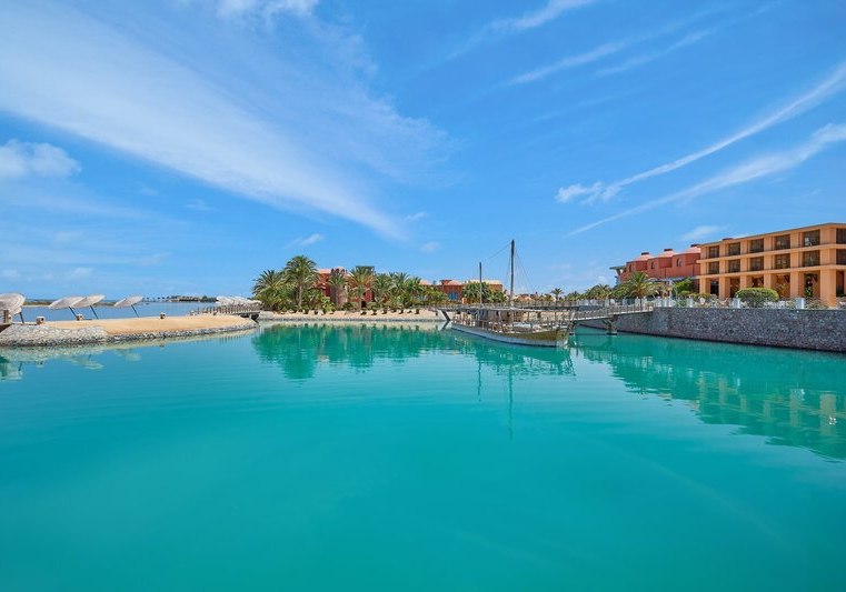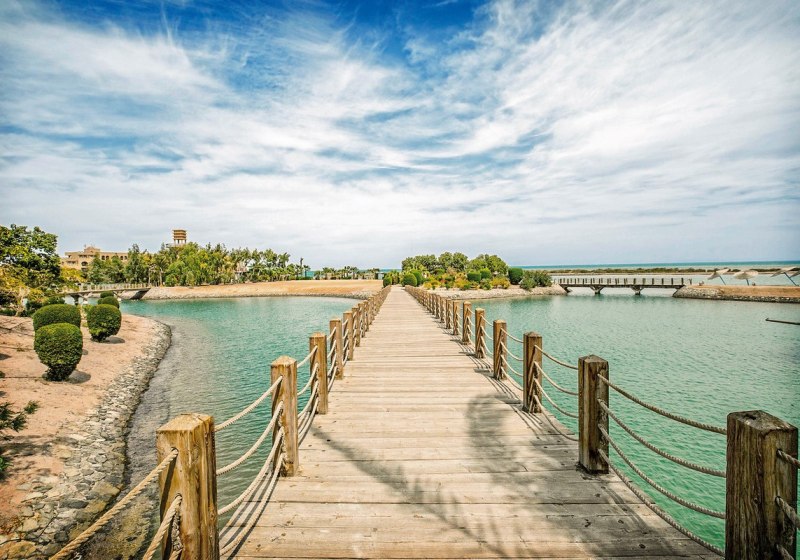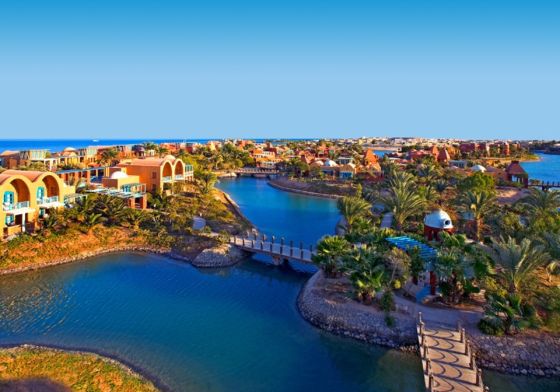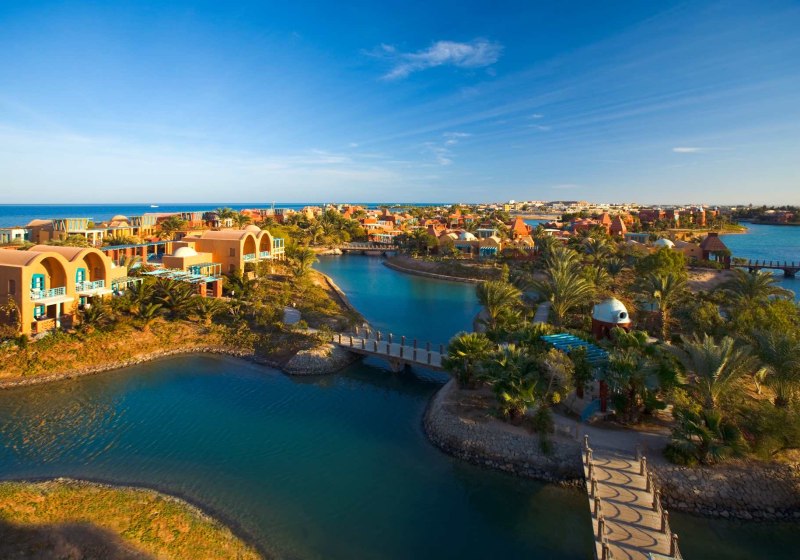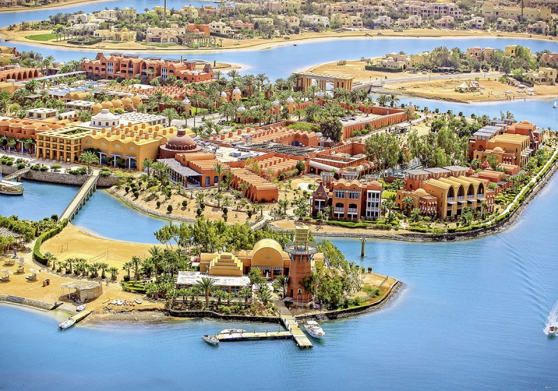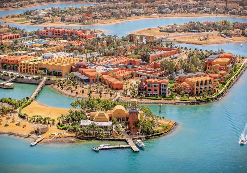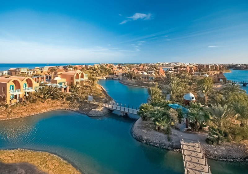 Ihr urlaubt in El Gouna, etwa 25 km nördlich von Hurghada und rund 40 km vom Flughafen Hurghada. Das Resort spannt sich über neun Inseln, die Ihr über Holzbrücken erreicht, mit direktem Zugang zu Lagunen und Sandstrand. Zeytouna Beach samt Pier liegt fußläufig, der Jachthafen ist circa 1.000 m entfernt und in etwa zehn Minuten zu Fuß erreichbar.
