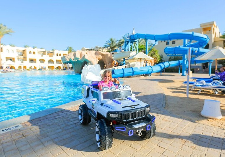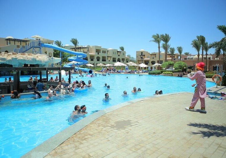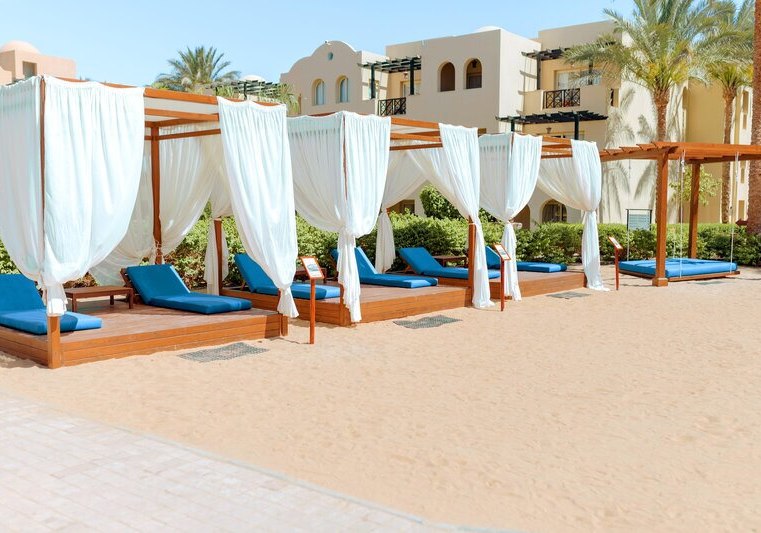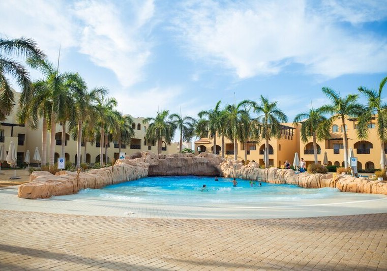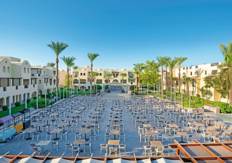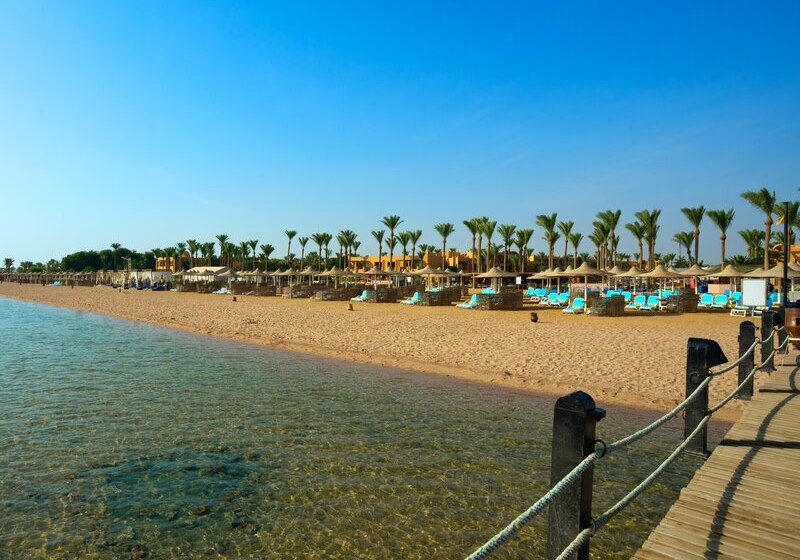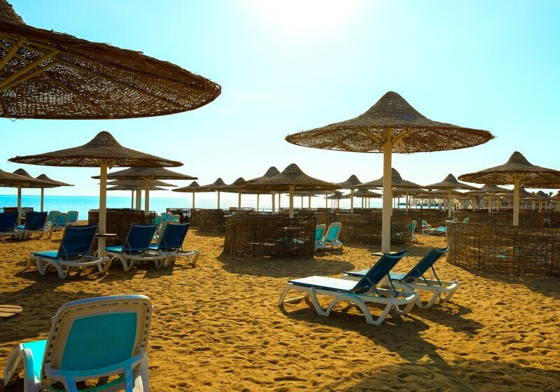Ihr wohnt in der Makadi Bay, rund 30 Kilometer südlich des Flughafens Hurghada und etwa 40 Kilometer vom Stadtzentrum entfernt. Der Sand-/Kiesstrand liegt an der Bucht und ist durch das Schwesterhotel getrennt. Ein Shuttlebus bringt Euch bequem zum Strand. Vor der Küste wartet ein Riff; ins tiefere Wasser gelangt Ihr über einen langen Steg.