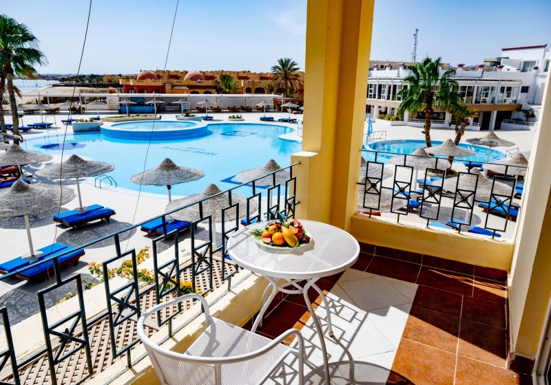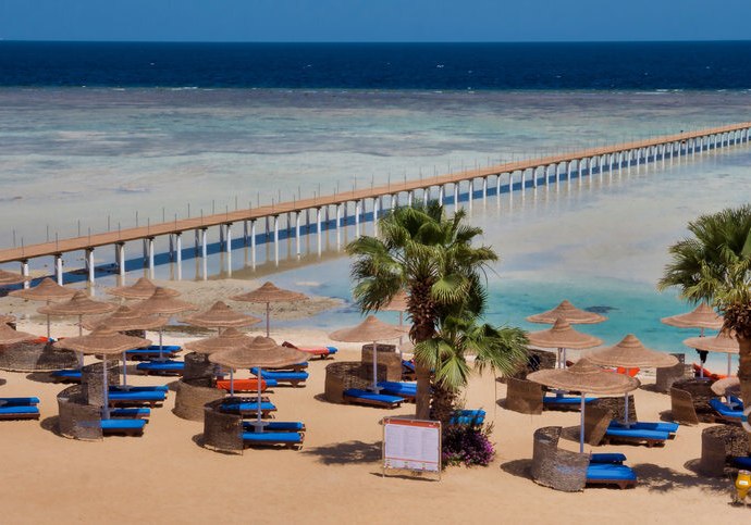Im Blue Reef Resort erlebt Ihr ein Resort direkt am eigenen, etwa 200 Meter langen Privatstrand von Marsa Alam. Der Badesteg führt über das vorgelagerte Riff zum Hausriff, das Schnorcheln und Tauchen ermöglicht. Die Anlage ist überschaubar mit 150 Zimmern auf zwei Etagen, wirkt dadurch angenehm persönlich und bietet klare Wege zwischen Strand, Pools und den zentralen Bereichen.