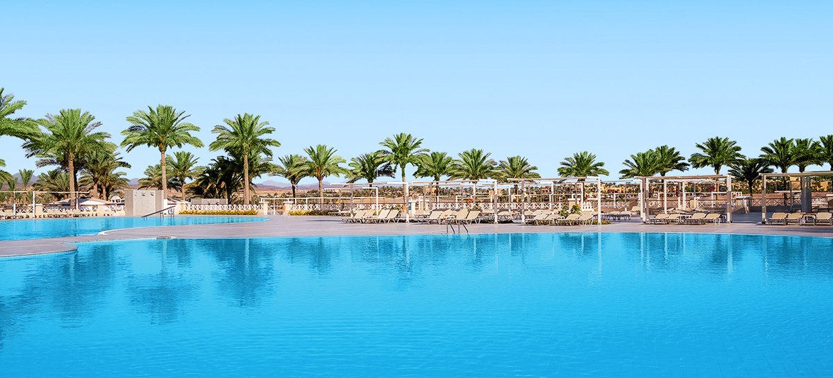 Die Anlage verfügt über 389 Zimmer, eine Lobby mit Rezeption und Wi‑Fi in allen Bereichen. Vier Außenpools – teils im Winter beheizt – sowie ein separater, beheizbarer Kinderpool bilden das Herzstück der Außenbereiche. Highlight: Hoteleigener Strand mit Liegen, Sonnenschirmen und Badetüchern.
