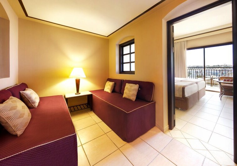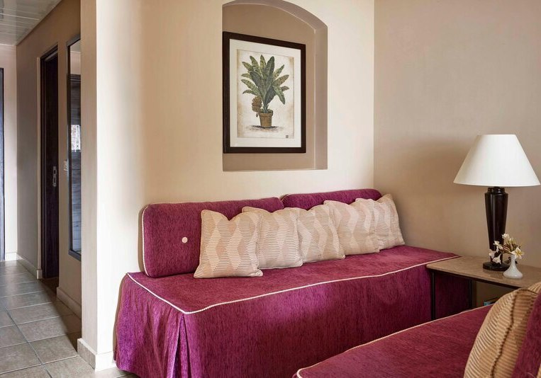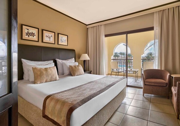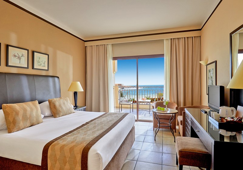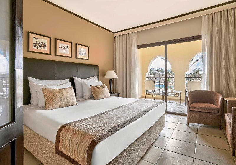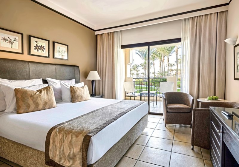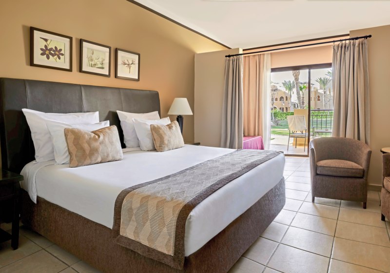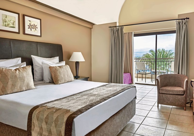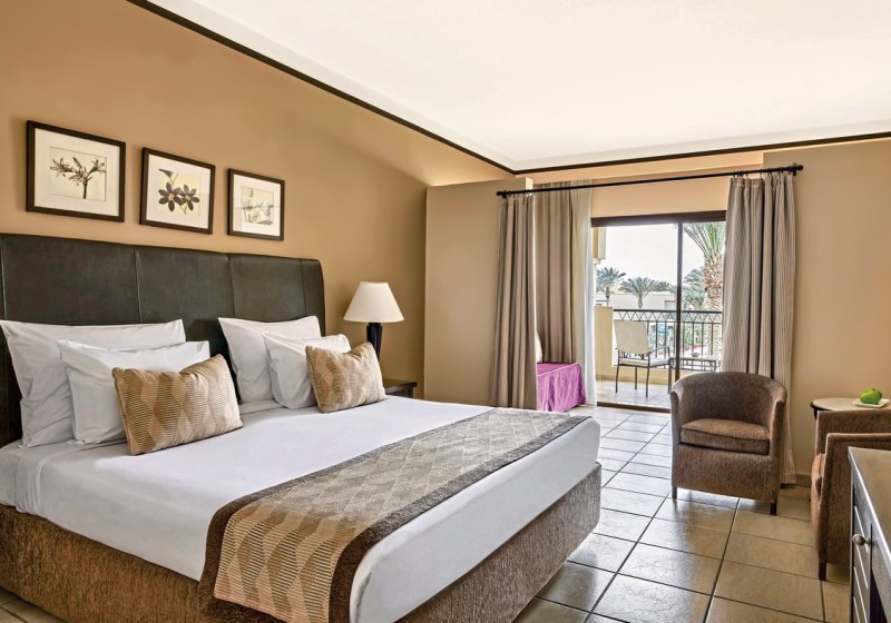 Eure Zimmer bieten Dusche/WC, Föhn, Klimaanlage/Heizung, Safe, Sat‑TV, Telefon sowie Tee‑/Kaffeezubereiter. Ein Balkon oder eine Terrasse gehört dazu, je nach Buchung mit Garten-, Pool- oder Meerblick. Die Größen reichen je nach Kategorie von etwa 37 bis 75 m². Highlight: Minibar buchbar gegen Gebühr.
