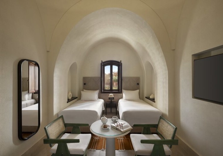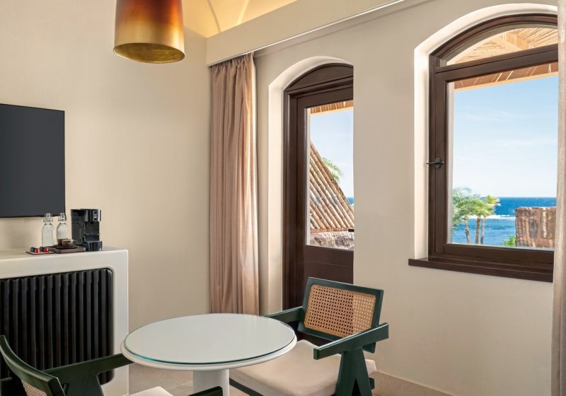 Im Mövenpick Resort El Quseir wohnt Ihr auf einem Felsplateau direkt am Meer und erreicht den hoteleigenen Sandstrand über eine Treppe. Die Gebäude sind niedrig, Wege kurz, die Atmosphäre angenehm ruhig. Zwei Poolanlagen, davon eine im Winter beheizt, strukturieren den Tag zwischen Wasser, Liegeterrassen und Blicken über die El Quadim Bucht.