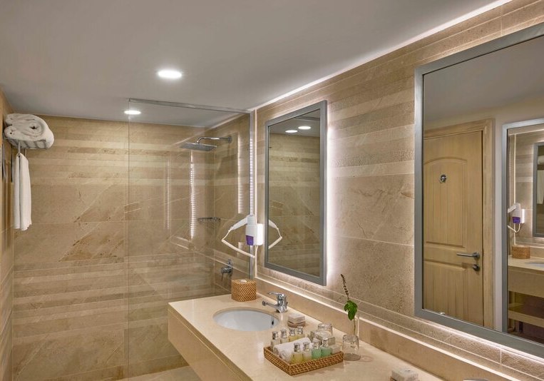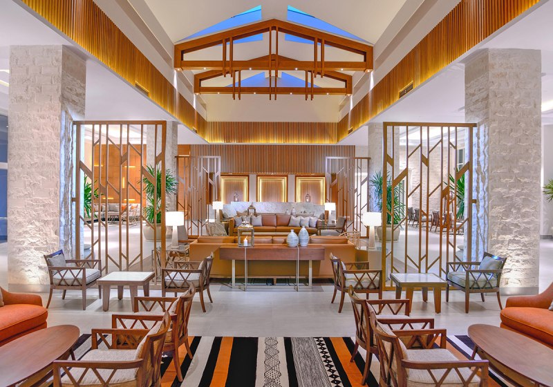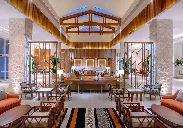 Die öffentlichen Bereiche sind funktional gegliedert: Empfangshalle mit Rezeption, Shops, Geldautomat und Sitzgelegenheiten, dazu Gartenflächen, Terrassen und eine Skybar auf dem Dach. Am Außenpool und im Kinderpool nutzt Ihr Liegen, Sonnenschirme und Badetücher; gleiches gilt am Strand. WiFi steht zur Verfügung, ebenso Lobbybar, Poolbar und Snackbar.