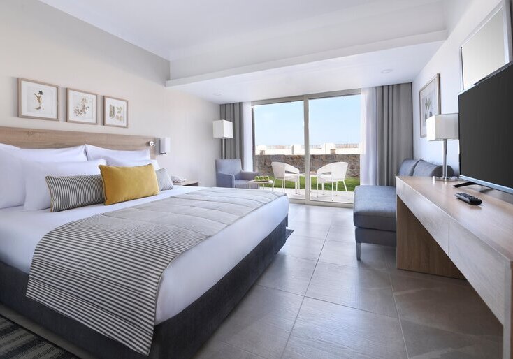 In 208 Zimmern wohnt Ihr mit funktionaler Ausstattung: Klimaanlage, Dusche, WC, Föhn, TV, Safe, Telefon, Kaffee-/Teezubereiter, Minibar, Bademantel und Hausschuhen. WiFi ist verfügbar. Balkon oder Terrasse öffnet den Blick – je nach Lage auf Garten, Pool, Bucht, Strand oder Meer. Fliesenboden und Vergrößerungsspiegel runden die Details ab.