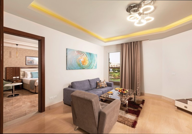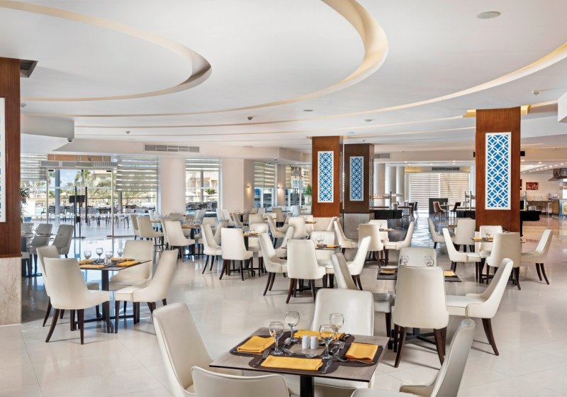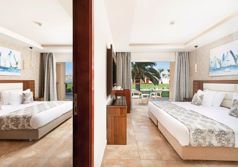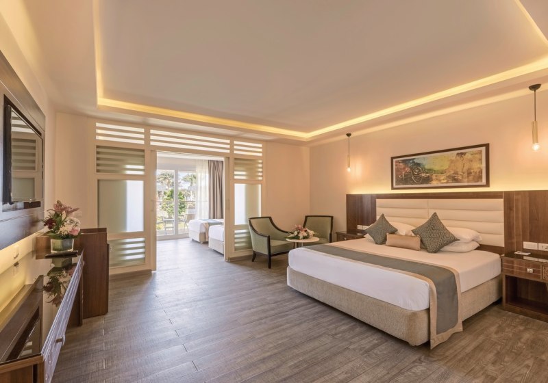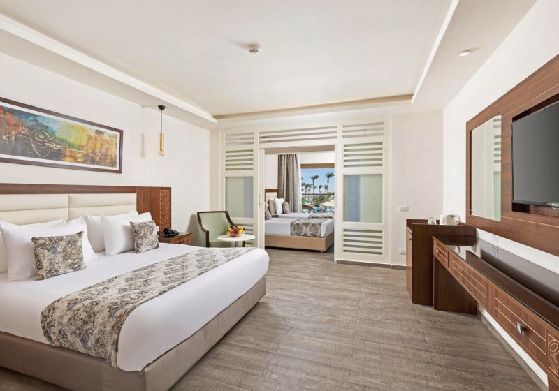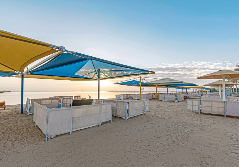 Im Pickalbatros Royal Moderna Resort wohnt Ihr direkt am Sandstrand der Nabq Bay und blickt auf ein weitläufiges Resort mit Aktiv- und Relaxzonen. Familien freuen sich über den separaten Aquapark für Erwachsene und Kinder, während Ruhesuchende den Relaxpool wählen. Die Atmosphäre wirkt lebendig, strukturiert und durchdacht, mit klaren Wegen zwischen Strand, Pools und Restaurants.