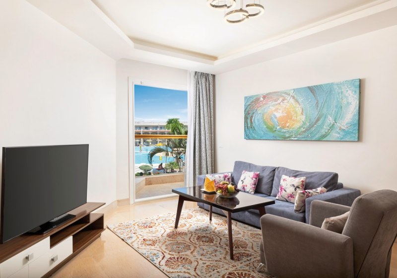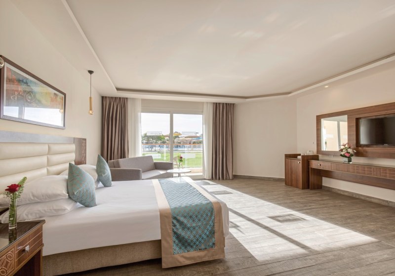 Mehr Raum geben Juniorsuiten mit rund 45 Quadratmetern und Poolblick. Super‑Sparzimmer entsprechen der Ausstattung der Doppelzimmer. Der Schwerpunkt liegt auf praktischer Aufteilung und verlässlichen Basics. So richtet Ihr den Blick wahlweise Richtung Poollandschaft oder Meer und organisiert Schlaf- und Aufenthaltsbereiche effizient.