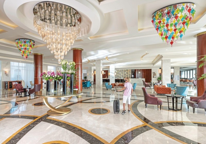 Die gemeinsamen Bereiche sind großzügig angelegt: Empfangshalle mit Rezeption, kostenfreies Wi‑Fi in allen Bereichen und Sonnenterrassen mit Liegen, Schirmen und Badetüchern am Pool und Strand. Für Abwechslung sorgen Showprogramme und Tages‑ sowie Abendanimation. Ihr plant eure perfekten Ferien mit kurzen Wegen, klaren Angeboten und verlässlichem Service.