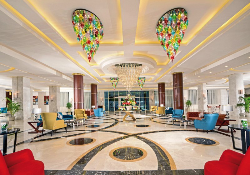 Das Resort umfasst 645 Zimmer im Hauptgebäude und zweistöckigen Nebengebäuden. Im Mittelpunkt stehen die Empfangshalle mit Rezeption, kostenfreies Wi‑Fi in allen Bereichen und weitläufige Sonnenterrassen. Ein Mini‑Market, Beautysalon, Apotheke und ein Geldautomat mit Wechselmöglichkeit erleichtern Alltägliches.