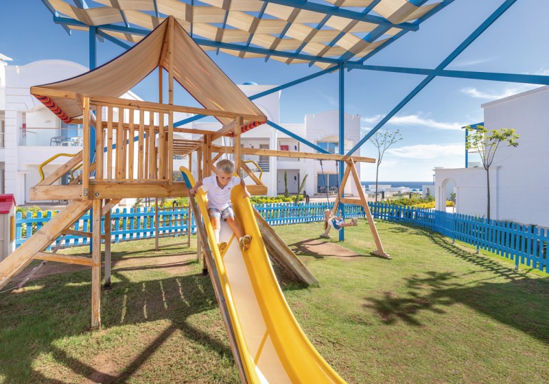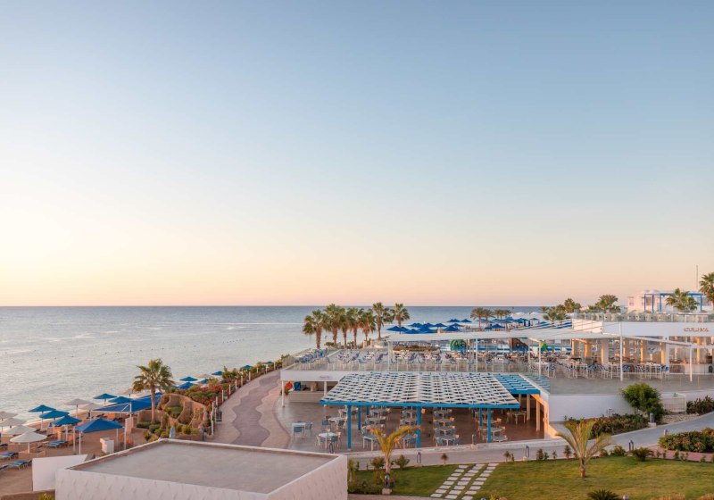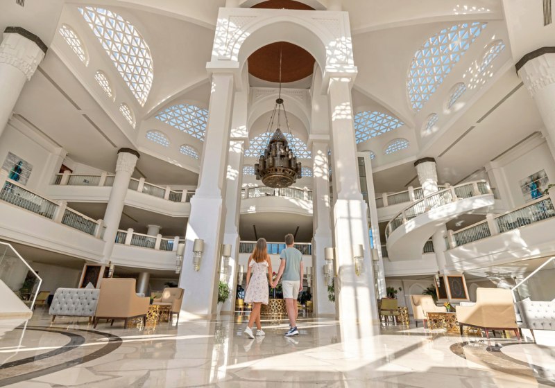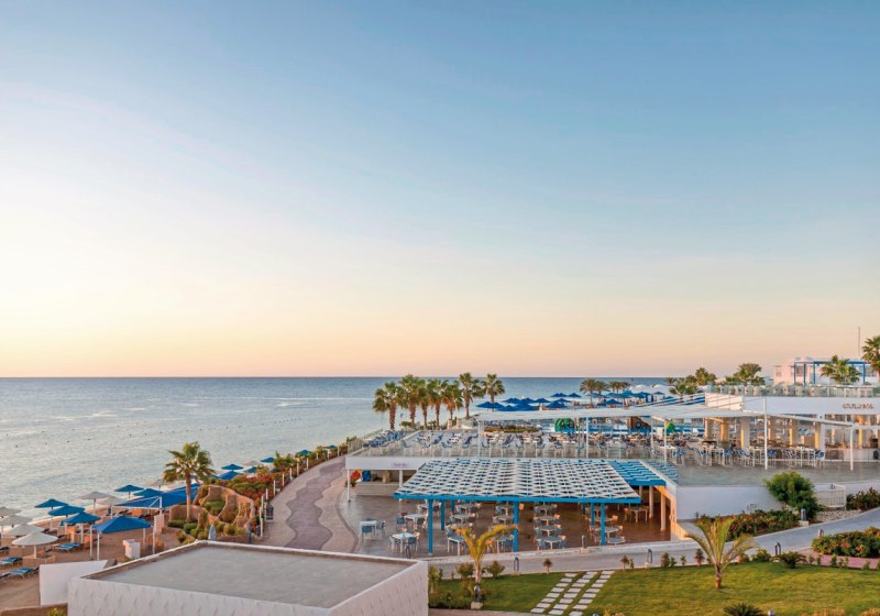 Das Resort inszeniert großzügige Außenbereiche: sieben Pools, davon einer im Winter beheizt, separater Kinderpool und ein Wasserpark mit 14 Rutschen. Am privaten Strand erleichtert ein schwimmender Steg den Zugang ins Wasser. Sonnenliegen und Schirme stehen an Pool und Strand bereit, Badetücher erhaltet Ihr bequem vor Ort.