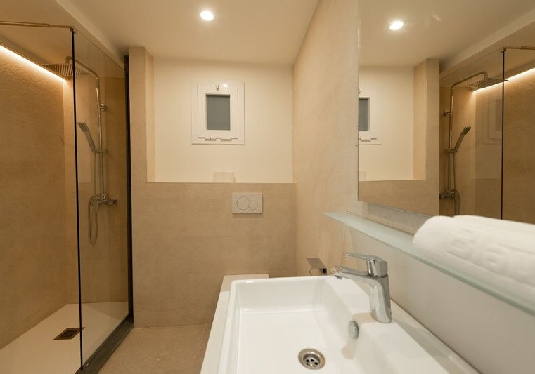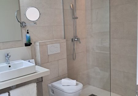 Je nach Kategorie genießt Ihr Balkon oder Terrasse; die Superior-Studios punkten mit möblierter Terrasse und eleganter Glastrennwand. Badezimmer sind funktional gehalten, auf Wunsch steht ein Mietsafe bereit. Für Familien eignen sich Appartements mit Wohnbereich und zusätzlicher Schlafmöglichkeit.