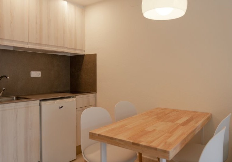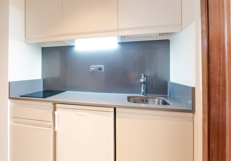 - Studio-Küche: Küchenzeile mit Kühlschrank, Mikrowelle sowie Tee/Kaffee-Setup.