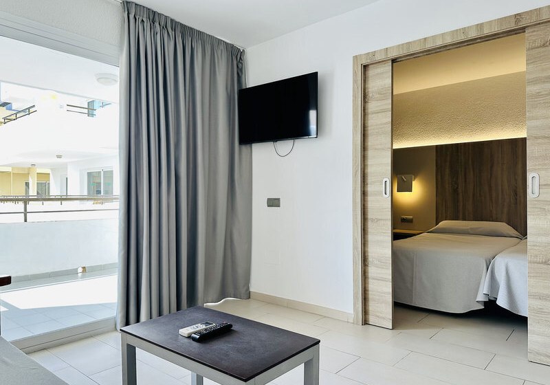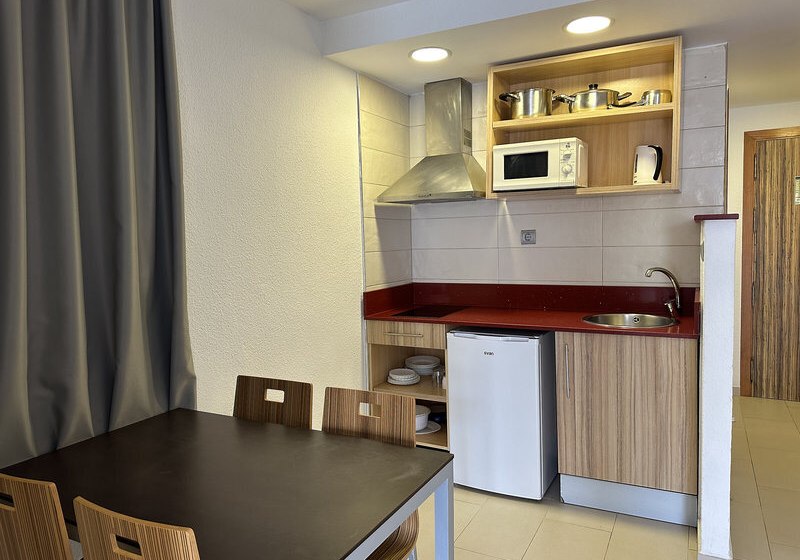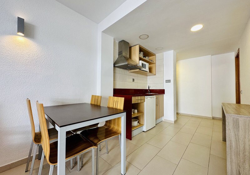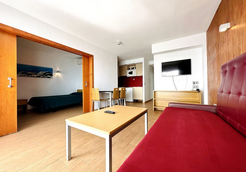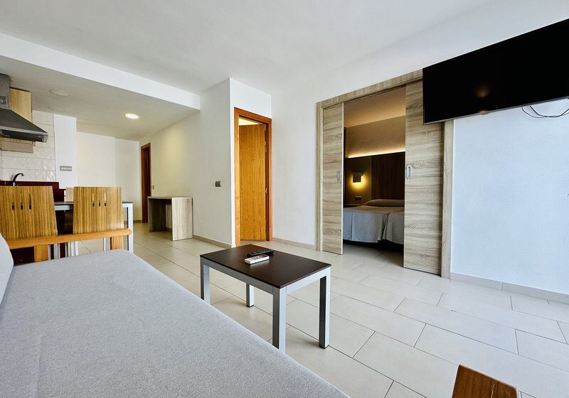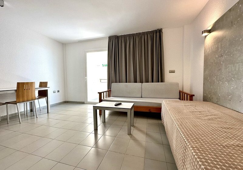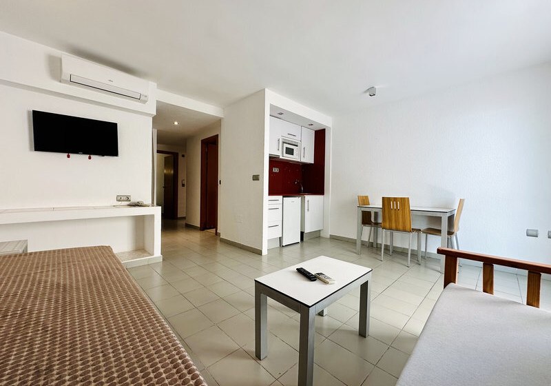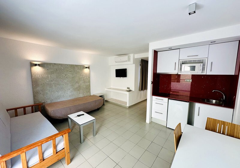 Ihr wohnt in Studios oder Appartements mit klaren Grundrissen und möblierten Balkonen. Studios bieten ca. 30 m², zwei Einzelbetten, Sofa, Sat-TV, Klimaanlage und Kitchenette mit Minikühlschrank und Mikrowelle. Appartements mit separatem Schlafzimmer starten bei ca. 40 m², die 2-Schlafzimmer-Variante bei ca. 60 m². Highlight: Geräumige Studios und Apartments mit Kitchenette und Balkon.