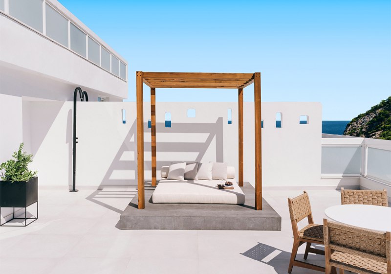 Im Mondrian Ibiza wohnt Ihr direkt an der Bucht Cala Llonga – mit feinem Sand vor der Tür und Blick auf das glitzernde Wasser. Das Haus verbindet mediterrane Leichtigkeit mit klarem, modernem Design. Ruhige Rückzugsorte wechseln sich mit lebendigeren Bereichen ab, in denen Ihr tagsüber entspannt verweilt und abends gesellig zusammenkommt.
