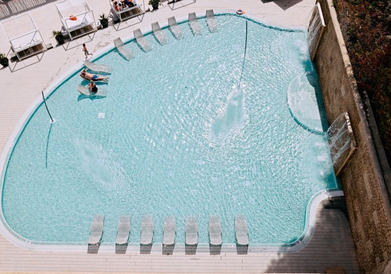 - Außenpool: Sonnenterrasse mit Liegen und Schirmen strukturiert entspannte Stunden.