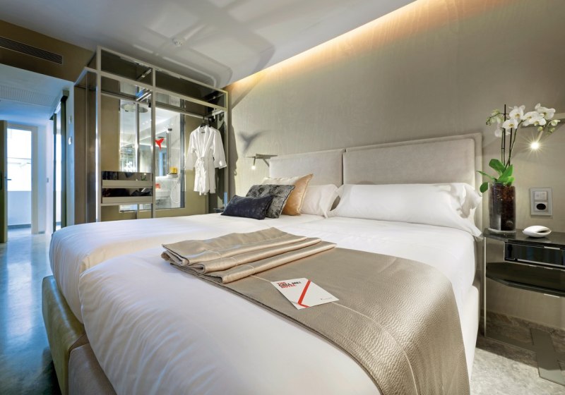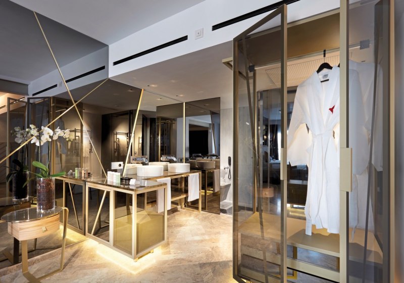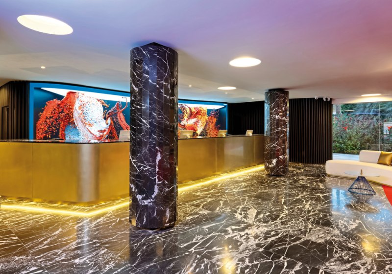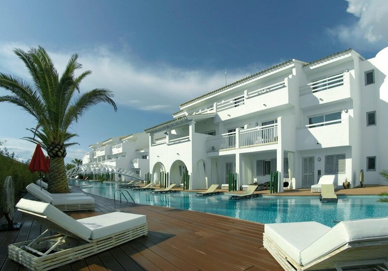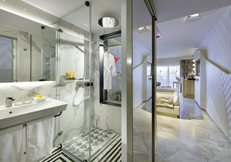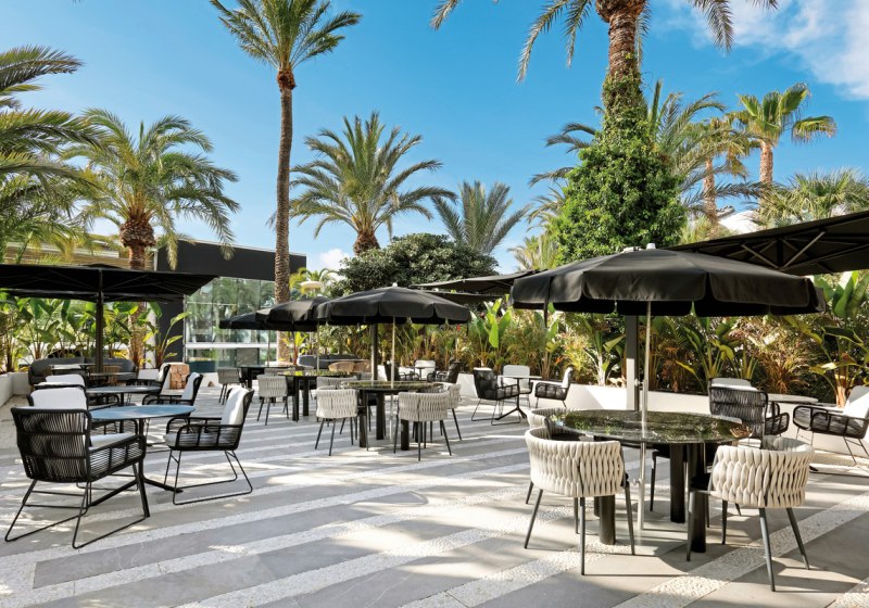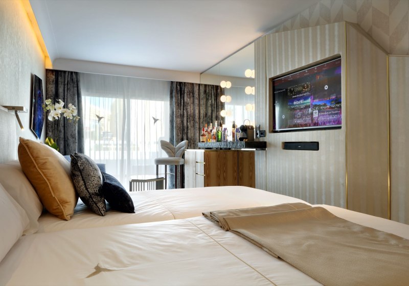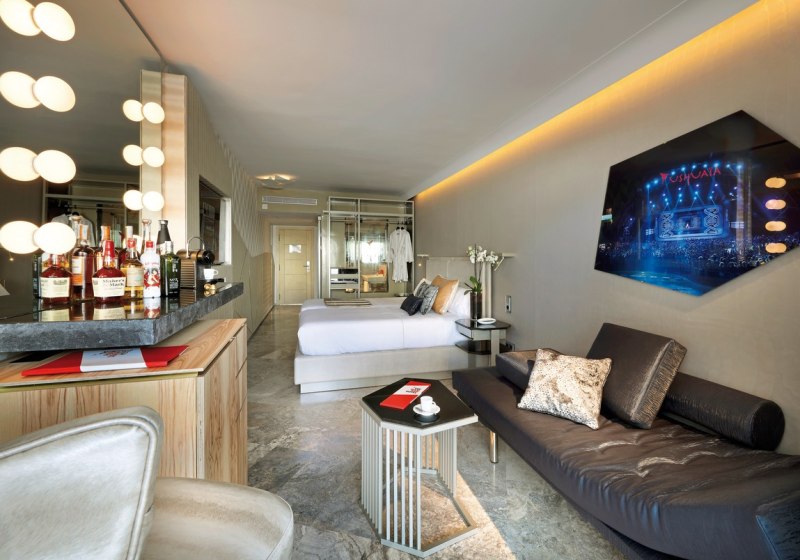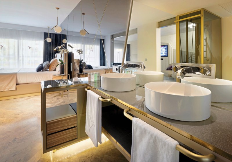 Die Infrastruktur ist breit aufgestellt: Drei Außenpools, Beach Club, Sonnenterrasse sowie Liegestühle, Sonnenschirme und Badetücher strukturieren den Tag am Wasser. Im Kern: eine moderne Anlage mit Empfangsbereich, Rezeption und Concierge.
