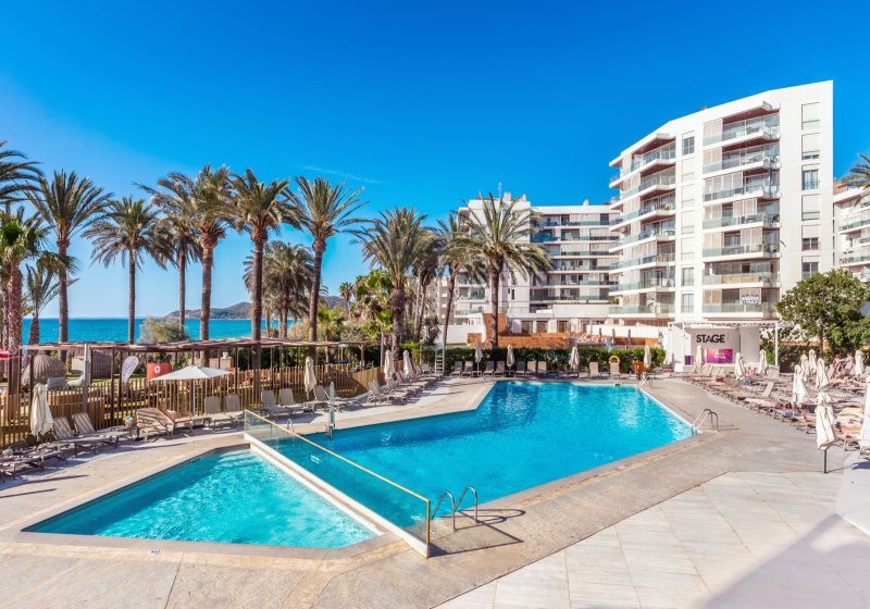 - Strandnähe pur: Direkt am Sandstrand der Playa d’en Bossa mit Pool am Meer.