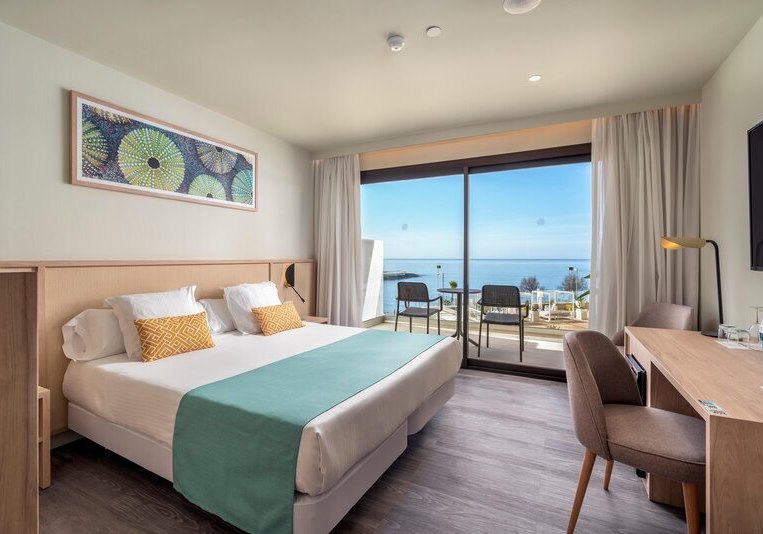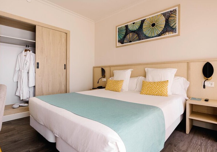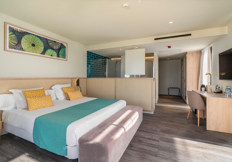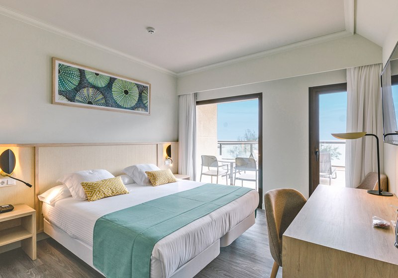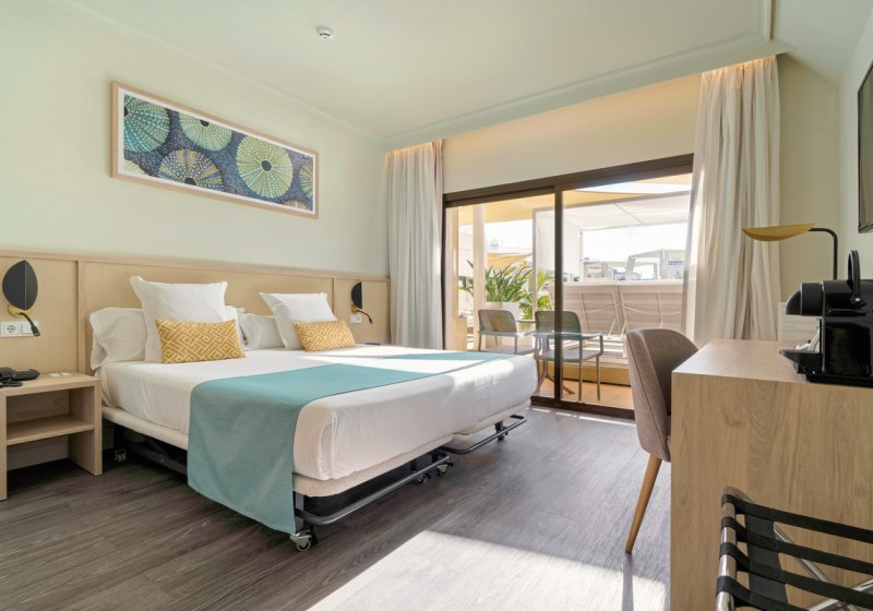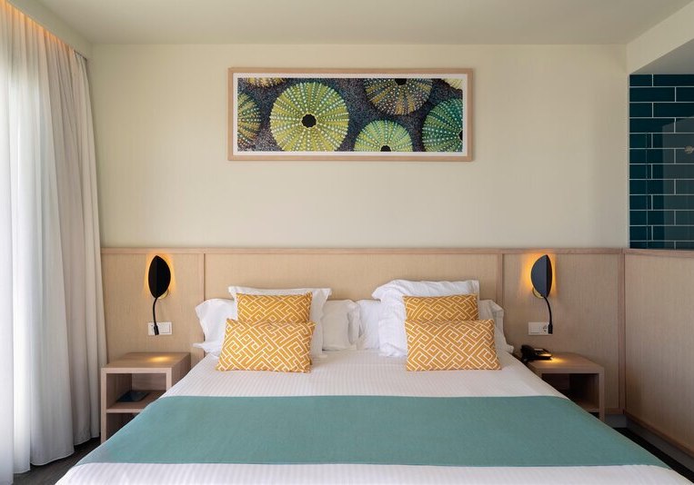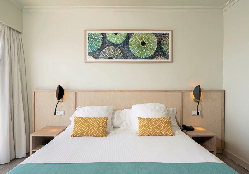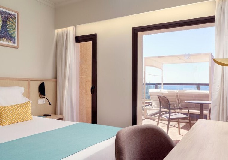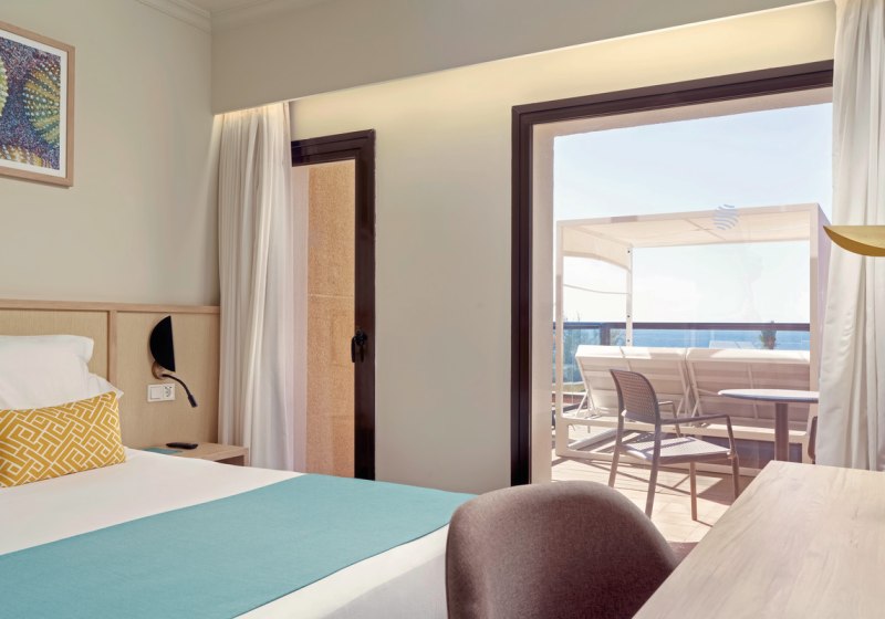 Viele Zimmerkategorien bieten Meer- oder Poolblick. Doppelbetten oder zwei Einzelbetten, Schrank, Telefon und Vergrößerungsspiegel runden den Komfort ab. Vier barrierefreie Einheiten sind auf Anfrage verfügbar. Highlight: Zimmer mit Meer- oder Poolblick für stimmige Ausblicke.