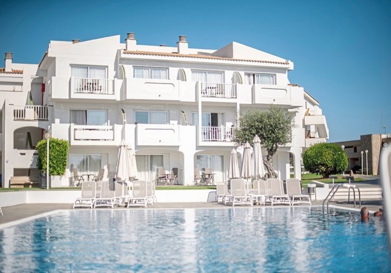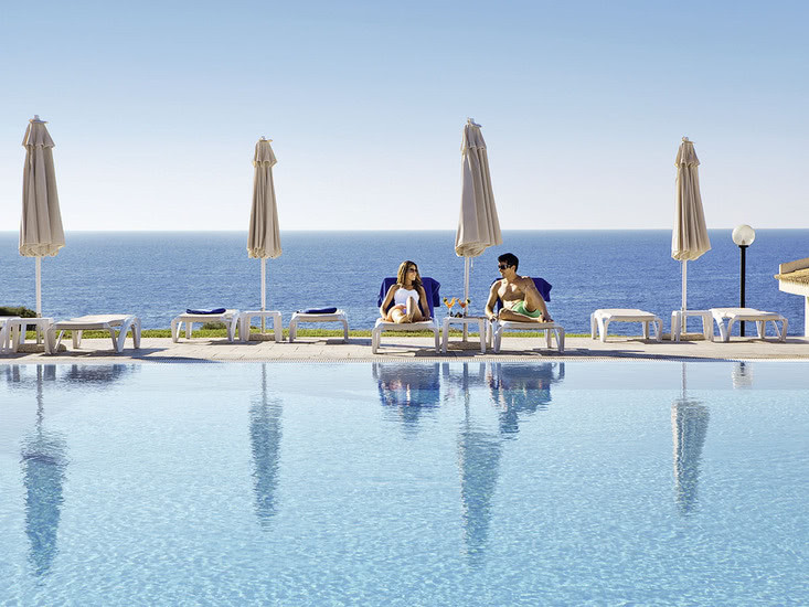 Die Anlage ist großzügig und funktional: Lobby mit Rezeption und Sitzgruppen, Aufenthaltsräume, Lifte und eine weitläufige Gartenstruktur. Zwei Poollandschaften inklusive Infinitypool mit Meerblick bilden den Mittelpunkt, eingerahmt von Terrassen mit Liegen und Schirmen. WLAN ist im ganzen Hotel kostenlos nutzbar.