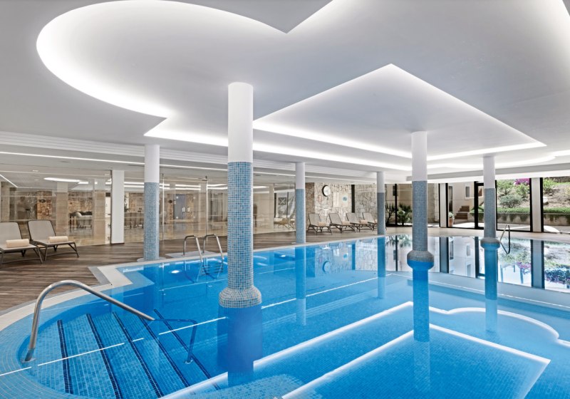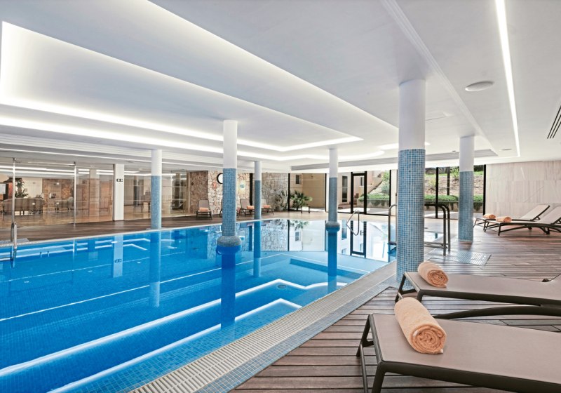 - Zwei Pools: Außenbereich mit Liegen, dazu Hallenbad für wetterunabhängige Bahnen.