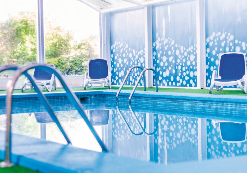 • Liegestühle • Hallenbad • Außenpool (saisonal) • Sonnenschirme • Pool • Poolbar • Sonnenterrasse • Badetücher