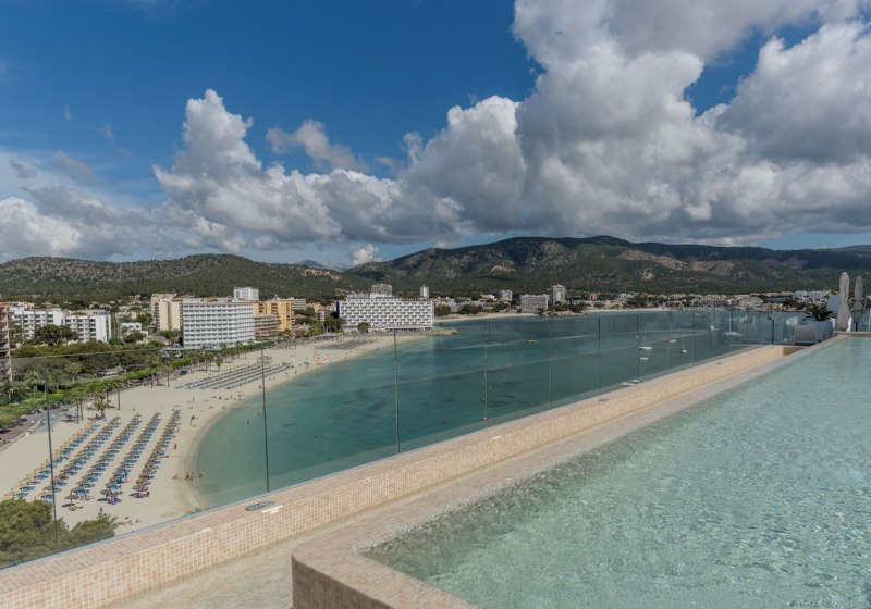 - Dachterrasse: Infinity-Pool und Sky-Bar als markanter Treffpunkt über dem Meer.