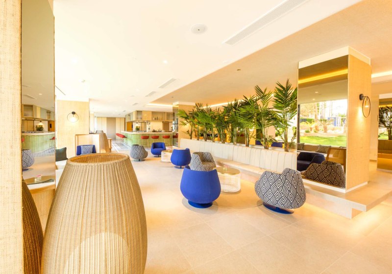 Das Hotel verteilt sich auf zwei Gebäude mit vier und neun Etagen und wirkt in den öffentlichen Bereichen klar gegliedert. Lifte, 24-Stunden-Rezeption und inklusives WLAN sorgen für reibungslose Abläufe. Die Sitz- und Sonnenterrassen bieten Raum für ruhige Phasen, Balibetten sind gegen Gebühr buchbar.