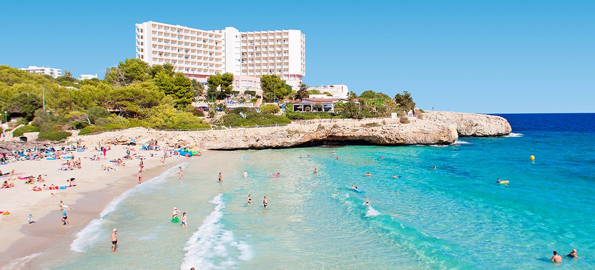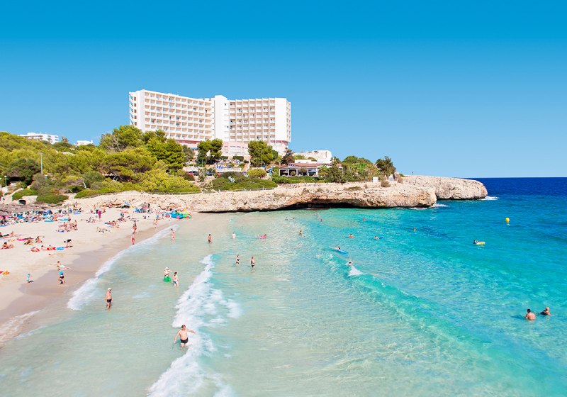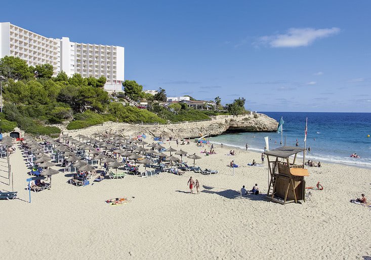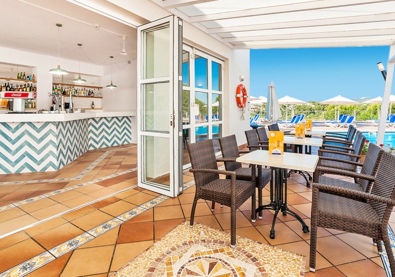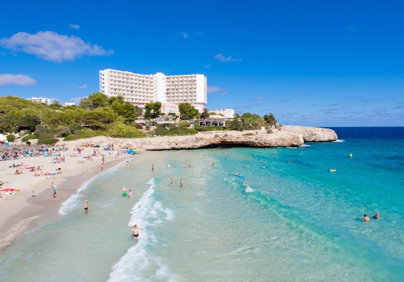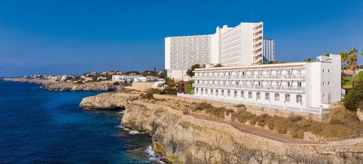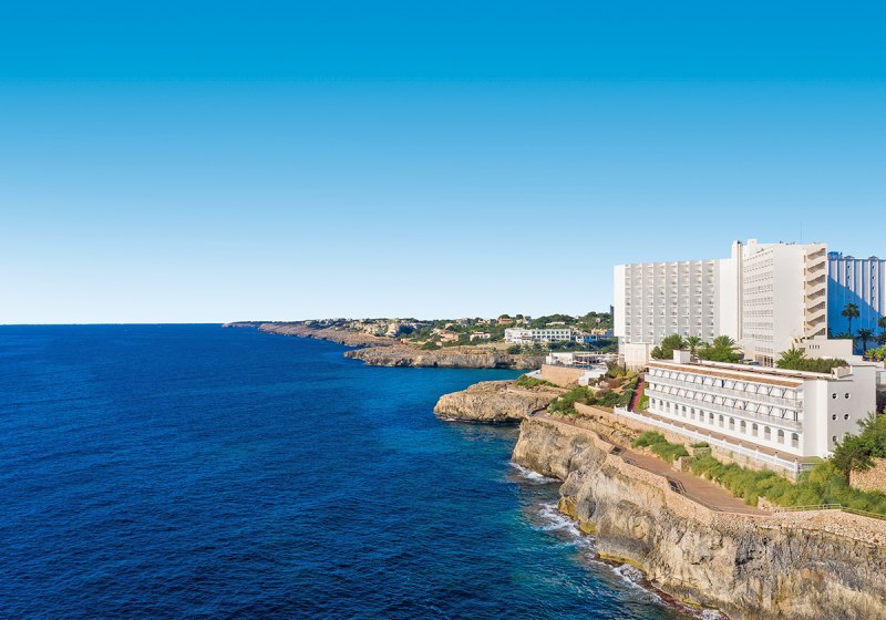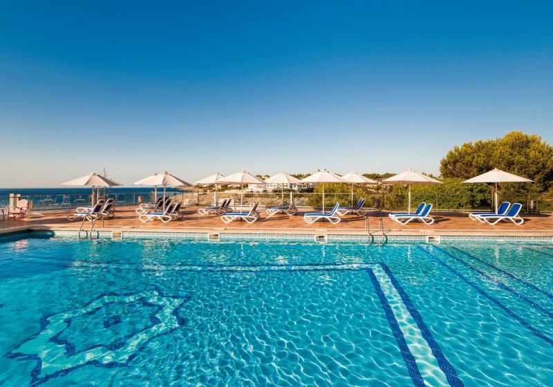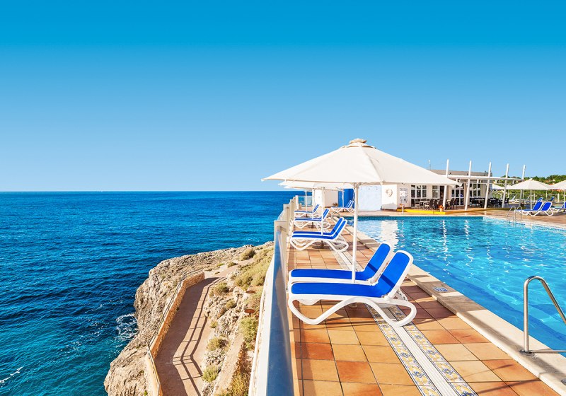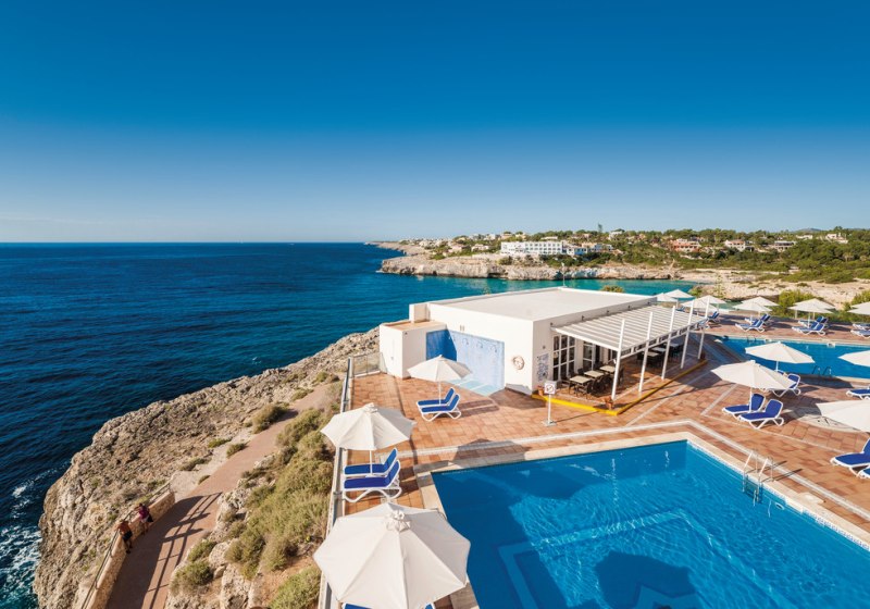 Globales América verbindet Felsenlage über der Cala Domingos mit kurzen Wegen: Strand und Ortszentrum liegen etwa 50 Meter entfernt, die Poollandschaft mit Kinderbecken und Terrassen schafft entspannte Struktur für Eure Tage.