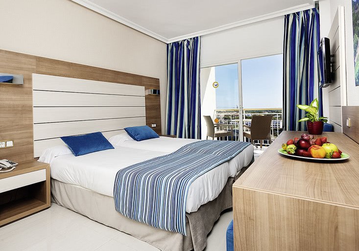 Die Zimmer sind funktional ausgestattet und auf Sommer ausgelegt: Klimaanlage, TV, Telefon, WLAN, Minikühlschrank sowie Safe (Miete). Das Bad bietet Dusche oder Badewanne, WC und Föhn. Viele Zimmer verfügen über einen Balkon, Meerblick ist buchbar; Familienzimmer kommen mit zusätzlichen Schlafmöglichkeiten.