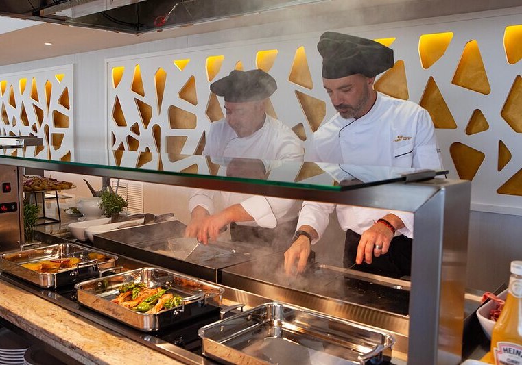 Im Buffetrestaurant startet Ihr mit einem vielseitigen Frühstück in den Tag und beschließt ihn mit Abendessen, das durch Live-Kochen eine frische Note erhält. Die Küche berücksichtigt verschiedene Ernährungsweisen mit klar ausgewiesenen vegetarischen, veganen, gluten- und laktosefreien Optionen sowie Diätgerichten. So bleibt Ihr bei Auswahl und Kontrolle über Eure Teller stets gelassen.