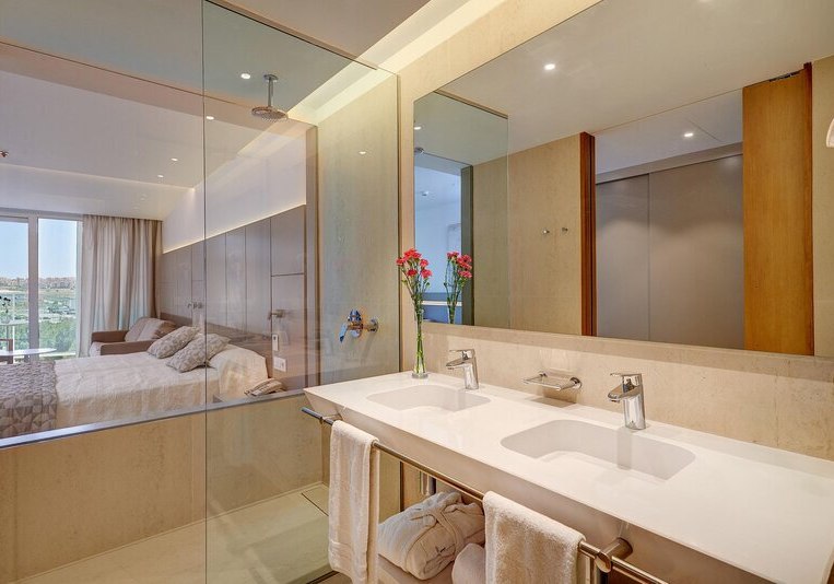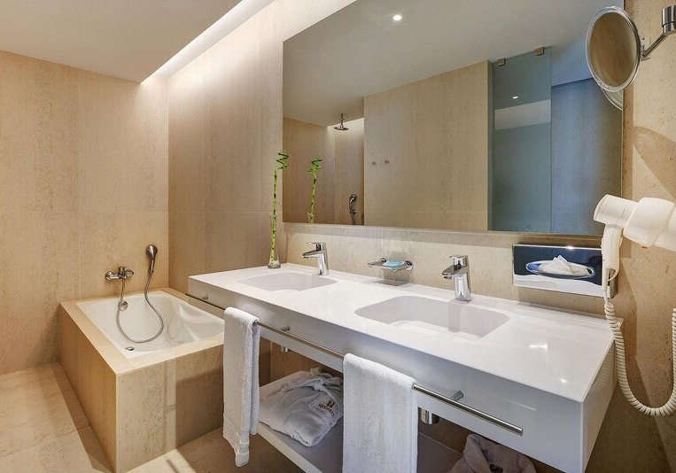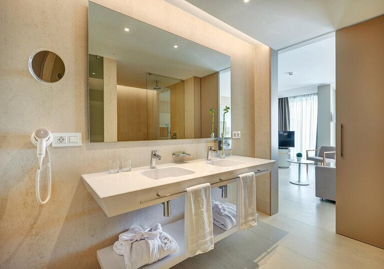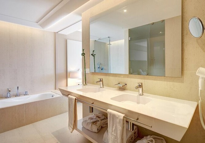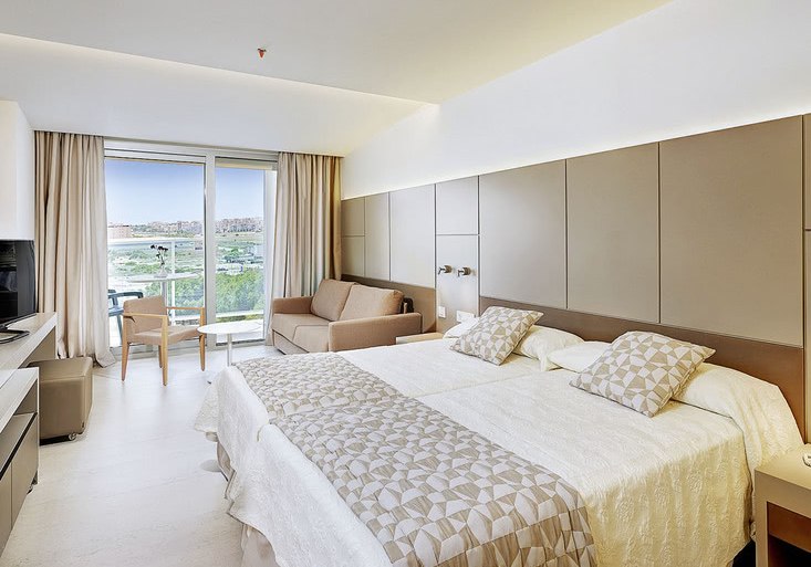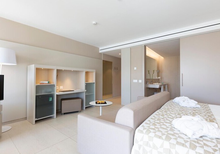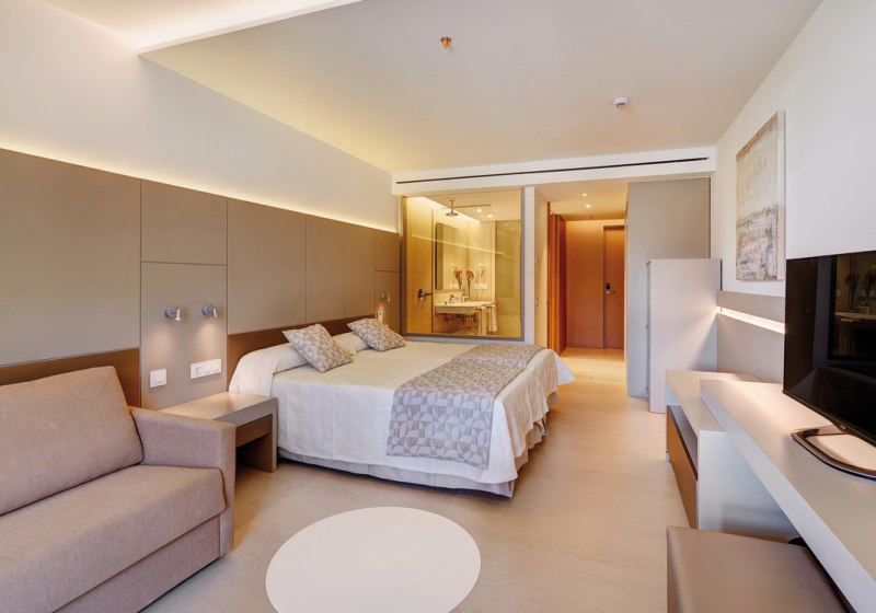 Die Doppelzimmer starten bei etwa 33 Quadratmetern, Juniorsuiten bei circa 38 Quadratmetern. Ausgestattet mit Klimaanlage/Heizung, TV, Telefon, Safe und kostenfreiem WLAN. Balkon oder Terrasse gehört dazu, die Minibar steht auf Anfrage gegen Gebühr bereit. Je nach Kategorie mit Dusche oder Badewanne.
