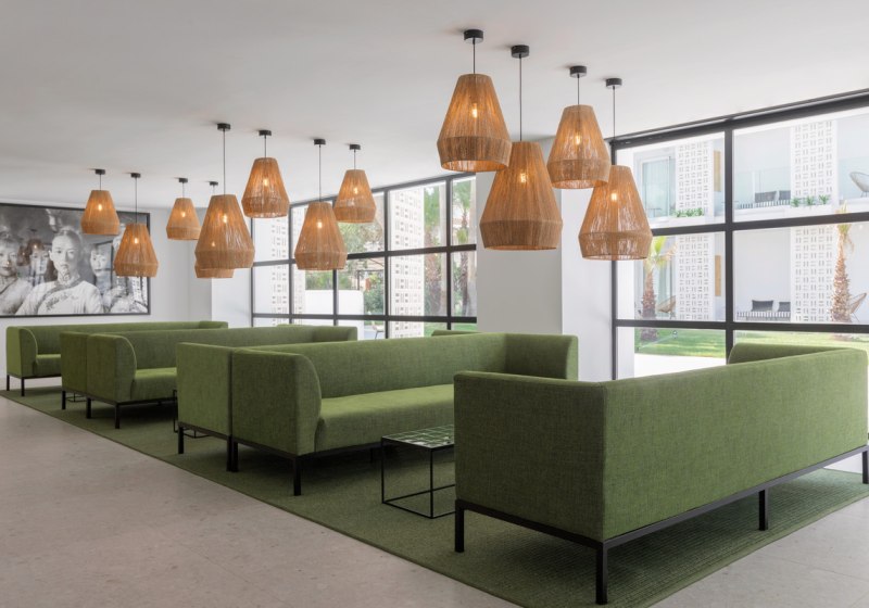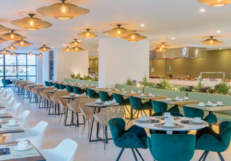 220 Zimmer, eine Lobby mit 24-Stunden-Rezeption und vier Lifte strukturieren das Haus. Loungebereiche, eine große Sonnenterrasse sowie die Dachterrasse mit zwei Pools bieten viel Platz im Freien. Drei Außenpools im Erdgeschoss verteilen die Badegäste. WLAN ist im gesamten Hotel kostenfrei.