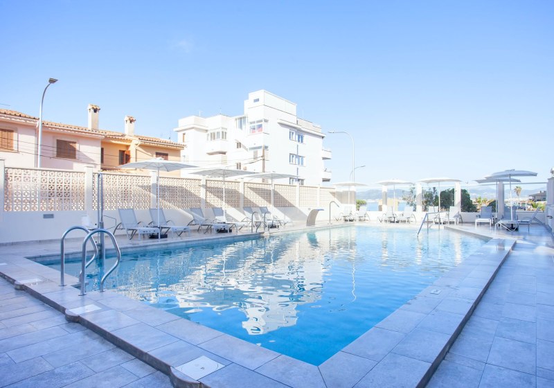 Im Hotel BQ Apolo wohnt Ihr in erster Meereslinie in Can Pastilla, mit Blick auf die Bucht und kurzen Wegen zur Cala Estancia. Das Haus ist ein ausgewiesenes Nichtraucherhotel und konzentriert sich auf klare Strukturen, viel Tageslicht und praktische Wege. 144 Zimmer verteilen sich auf sechs Etagen, serviert von zwei Liften. Die Gemeinschaftsbereiche wirken aufgeräumt: Lobby mit Rezeption, Sitzgelegenheiten und direktem Zugang zur Sonnenterrasse. Draußen lädt der Poolbereich mit Liegen und Schirmen zum geruhsamen Tagesrhythmus zwischen Badepause und Lesestunde ein.