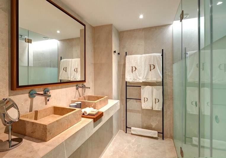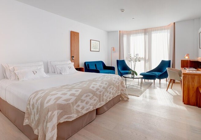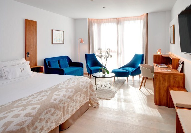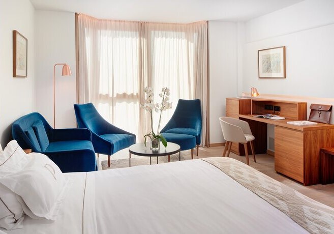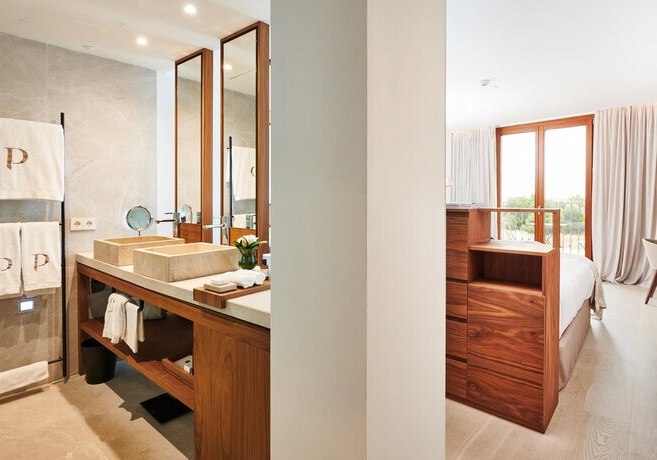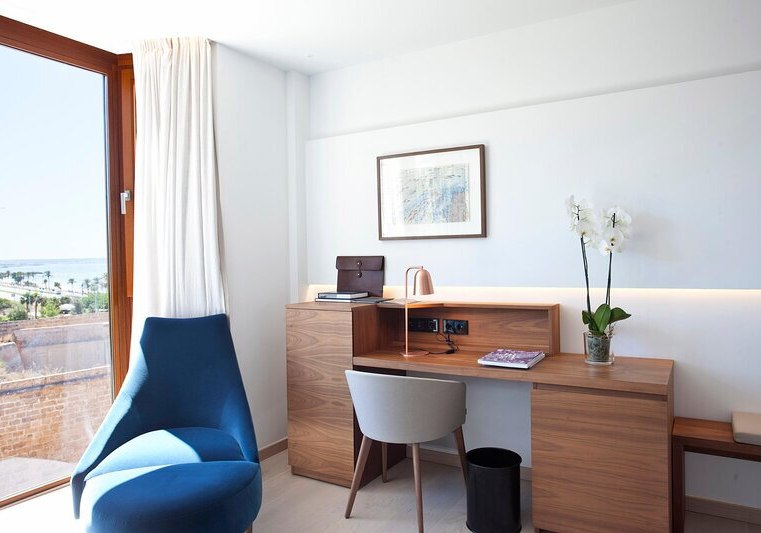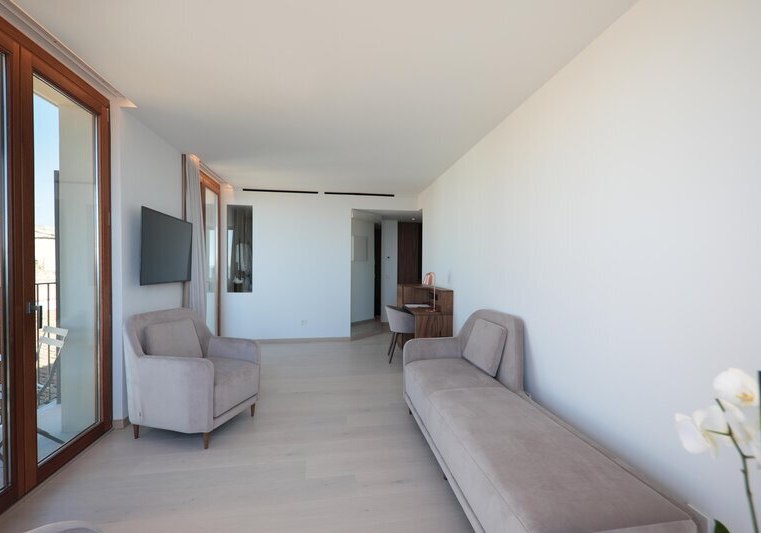 Im Hotel Es Princep wohnt Ihr in einem 5-Sterne-Boutique-Hotel mit 68 Zimmern auf fünf Etagen – kompakt, überschaubar und auf Ruhe ausgerichtet. Die Dachterrasse spannt den Blick über Palma und das Meer, unten empfängt Euch ein aufgeräumter Lobbybereich mit Rezeption, Leseecke und verlässlichem WLAN. Die Atmosphäre ist urban, mit klaren Linien statt Schnörkeln. Ihr trefft hier Städtereisende, Strandbegeisterte und Erholungssuchende, die kurze Wege schätzen.